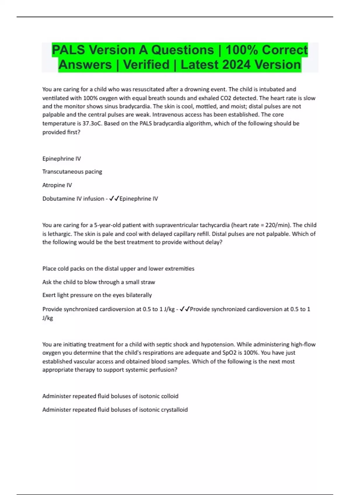 PALS Version A Questions | 100% Correct Answers | Verified | Latest 2024 Version