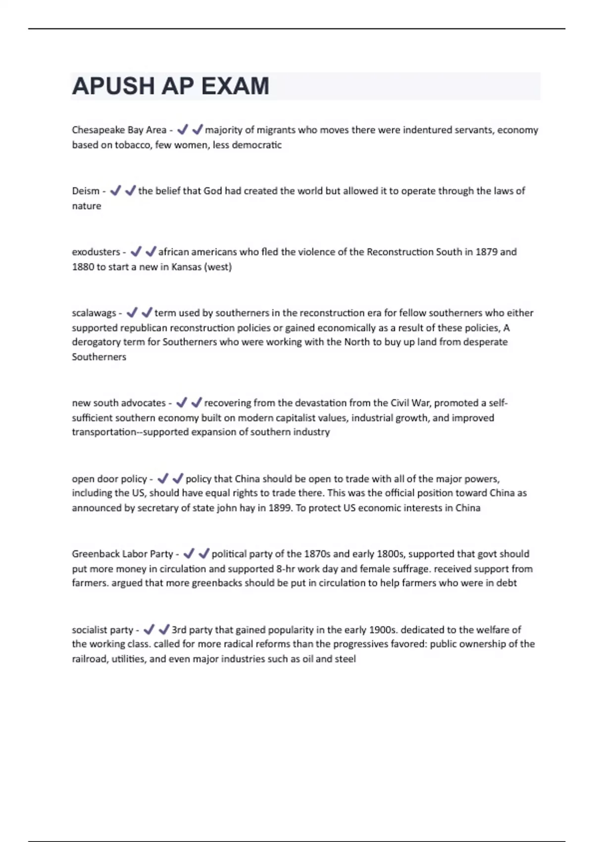 Chesapeake Bay Area - majority of migrants who moves there were indentured servants, economy based on tobacco, few women, less democratic Deism - the belief that God had created the world but allowed it to operate through the laws of nature exodusters - african americans who fled the violence of the Reconstruction South in 1879 and 1880 to start a new in Kansas (west) scalawags - term used by southerners in the reconstruction era for fellow southerners who either supported republican reconstruction policies or gained economically as a result of these policies, A derogatory term for Southerners who were working with the North to buy up land from desperate Southerners new south advocates - recovering from the devastation from the Civil War, promoted a selfsufficient southern economy built on modern capitalist values, industrial growth, and improved transportation--supported expansion of southern industry open door policy - policy that China should be open to trade with all of the major powers, including the US, should have equal rights to trade there. This was the official position toward China as announced by secretary of state john hay in 1899. To protect US economic interests in China Greenback Labor Party - political party of