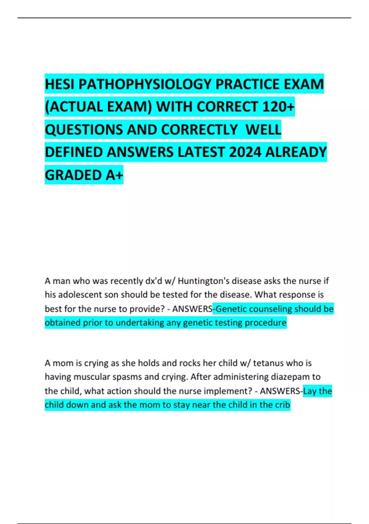 HESI PATHOPHYSIOLOGY PRACTICE EXAM (ACTUAL EXAM) WITH CORRECT 120+ QUESTIONS AND CORRECTLY WELL DEFINED ANSWERS LATEST 2024 ALREADY GRADED A+