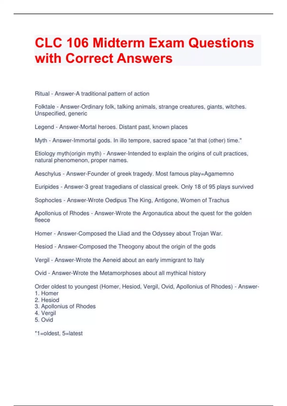 CLC 106 Midterm Exam Questions with Correct Answers Ritual - Answer-A traditional pattern of action Folktale - Answer-Ordinary folk, talking animals, strange creatures, giants, witches. Unspecified, generic Legend - Answer-Mortal heroes. Distant past, known places Myth - Answer-Immortal gods. In illo tempore, sacred space "at that (other) time." Etiology myth(origin myth) - Answer-Intended to explain the origins of cult practices, natural phenomenon, proper names. Aeschylus - Answer-Founder of greek tragedy. Most famous play=Agamemno Euripides - Answer-3 great tragedians of classical greek. Only 18 of 95 plays survived Sophocles - Answer-Wrote Oedipus The King, Antigone, Women of Trachus Apollonius of Rhodes - Answer-Wrote the Argonautica about the quest for the golden fleece Homer - Answer-Composed the Lliad and the Odyssey about Trojan War. Hesiod - Answer-Composed the Theogony about the origin of the gods Vergil - Answer-Wrote the Aeneid about an early immigrant to Italy Ovid - Answer-Wrote the Metamorphoses about all mythical history