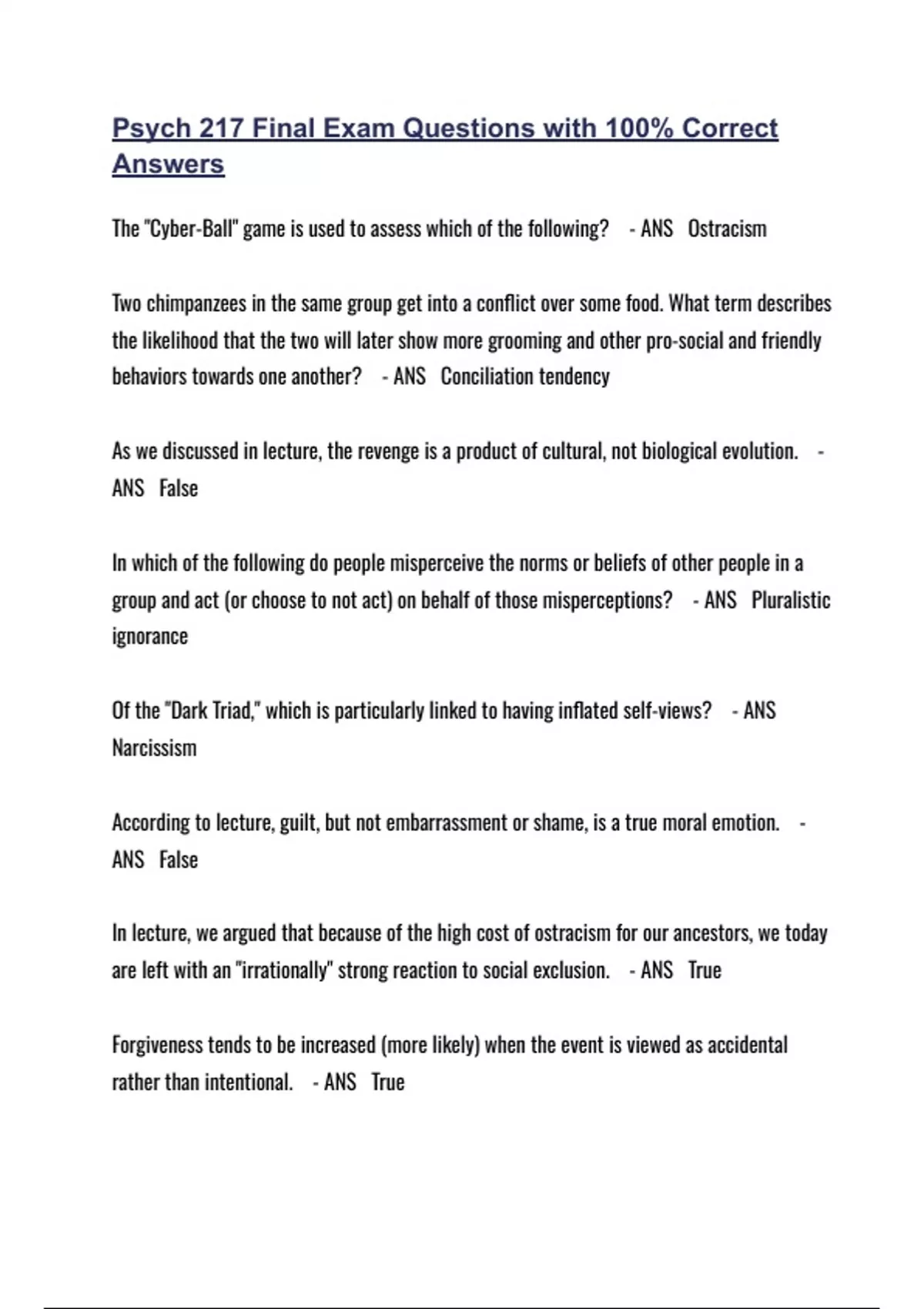 The "Cyber-Ball" game is used to assess which of the following? - ANS Ostracism Two chimpanzees in the same group get into a conflict over some food. What term describes the likelihood that the two will later show more grooming and other pro-social and friendly behaviors towards one another? - ANS Conciliation tendency As we discussed in lecture, the revenge is a product of cultural, not biological evolution. - ANS False In which of the following do people misperceive the norms or beliefs of other people in a group and act (or choose to not act) on behalf of those misperceptions? - ANS Pluralistic ignorance Of the "Dark Triad," which is particularly linked to having inflated self-views? - ANS Narcissism According to lecture, guilt, but not embarrassment or shame, is a true moral emotion. - ANS False In lecture, we argued that because of the high cost of ostracism for our ancestors, we today are left with an "irrationally" strong reaction to social exclusion. - ANS True Forgiveness tends to be increased (more likely) when the event is viewed as accidental rather than intentional. - ANS True The Darley and Batson Minister Study indicates that there are dramatic differences in helping rates between people whose personality types are altruistic rather than narcissistic. - ANS False According to lecture, apologies are most effective when you provide excuses for the negative event for which you are apologizing. - ANS False In lecture, we reviewed research that helping that is caused by feeling distress rather than sympathy is not real helping. - ANS False Of the "Dark Triad," which is particularly linked to being low in anxiety? - ANS Psychopathy The DePaulo et al. Interaction Study showed that: - ANS People told lies in about 20% of interactions AND When people told lies, the majority of times it was an outright fabrication When people tell serious lies, it is most commonly towards people with whom they have a close social relationship. - ANS True Carlsmith's Mood Expectancy Study discussed in lecture was designed to examine the idea of catharsis from revenge and retaliation. - ANS True According to the lecture, asking a romantic partner for a time-out during an argument so that you can collect your thoughts and cool down is an example of "stone-walling." - ANS False According to lecture, "stone-walling" (the silent treatment) is one of the indicators of divorce in Gottman's research. - ANS True The De Quervain Neuro-Imaging study studied which of the following? - ANS Retaliation The Eisenberg Video Study suggests that feeling empathy for a person can lead to heart rate deceleration (slowing down of heart rate) when viewing a person in distress. - ANS True The Bond and DePaulo 2006 Meta Analysis showed that: - ANS We are barely above chance in correctly detecting the truth/lies of others AND We have a propensity to believe people's statements, even when false According to the International Convention for the Prevention and Punishment of the Crime of Genocide, it is important to be able to provide evidence that the perpetrators had the goal of "total extermination" of the victimized group. - ANS False According to the lecture, climate change is likely to lead to coastal flooding, exacerbation of weather extremes, drought intensity, and the spread of diseases to new areas. - ANS True According to Stanton's list of the "Stages of Genocide", organization is the first stage in the process. - ANS False Sherif's research shows that during conflict, aggressive individuals rose in popularity/leadership. - ANS True According to the Marshall et al. Cambodian Study, the degree of trauma experienced during the genocide was not related to the rate of PTSD. - ANS False According to lecture, the Truth and Reconciliation Commission approach to intergroup reconciliation requires both sides in an intergroup conflict be willing to participate. - ANS True The "Trail of Tears" is the name given to the forced marches of Native Americans during Andrew Jackson's Presidency. - ANS True In the aftermath of violent conflict, which of the following may be true? - ANS Physical and civil infrastructure may be damaged, People may be traumatized, People may have a desire for retaliation According to lecture, post-traumatic stress disorder (PTSD) is largely untreatable. - ANS False In a Truth and Reconciliation Commission, a major goal is to prosecute low-level perpetrators of crimes during the conflict. - ANS False According to the lecture, the unemployment rate was over 15% for most of the 1930's during the Great Depression. - ANS True Pettigrew's European study showed that contact with outgroup members in a person's neighborhood had a stronger link to positive changes in attitudes than did friendships or work relationships. - ANS False In lecture, we discussed a study that examined survivors of the Cambodian genocide who now reside in the United States. According to lecture, what percentage of these people suffer from post-traumatic stress disorder? - ANS About 60% According to lecture, one area that has experienced fewer genocides than other areas of the globe is: - ANS None of the choices In our class, we discussed the idea of motivational autonomy which suggests that the operation of basic psychological and biological building blocks are influenced by our local culture, our developmental history, and our personal choices. - ANS True The Tam Northern Ireland Study found that intergroup contact was associated with trust and forgiveness. - ANS True According to lecture, rates of violence are at low levels compared to most (or possibly all) of human history. - ANS True In lecture, I discussed how even though the coronavirus outbreak is severe challenges, our species has overcome greater challenges in the past. - ANS True According to Stanton's list of the "Stages of Genocide", denial is the last stage in the process. - ANS True According to lecture, the Armenian genocide is an example of a "contested" genocide. - ANS True