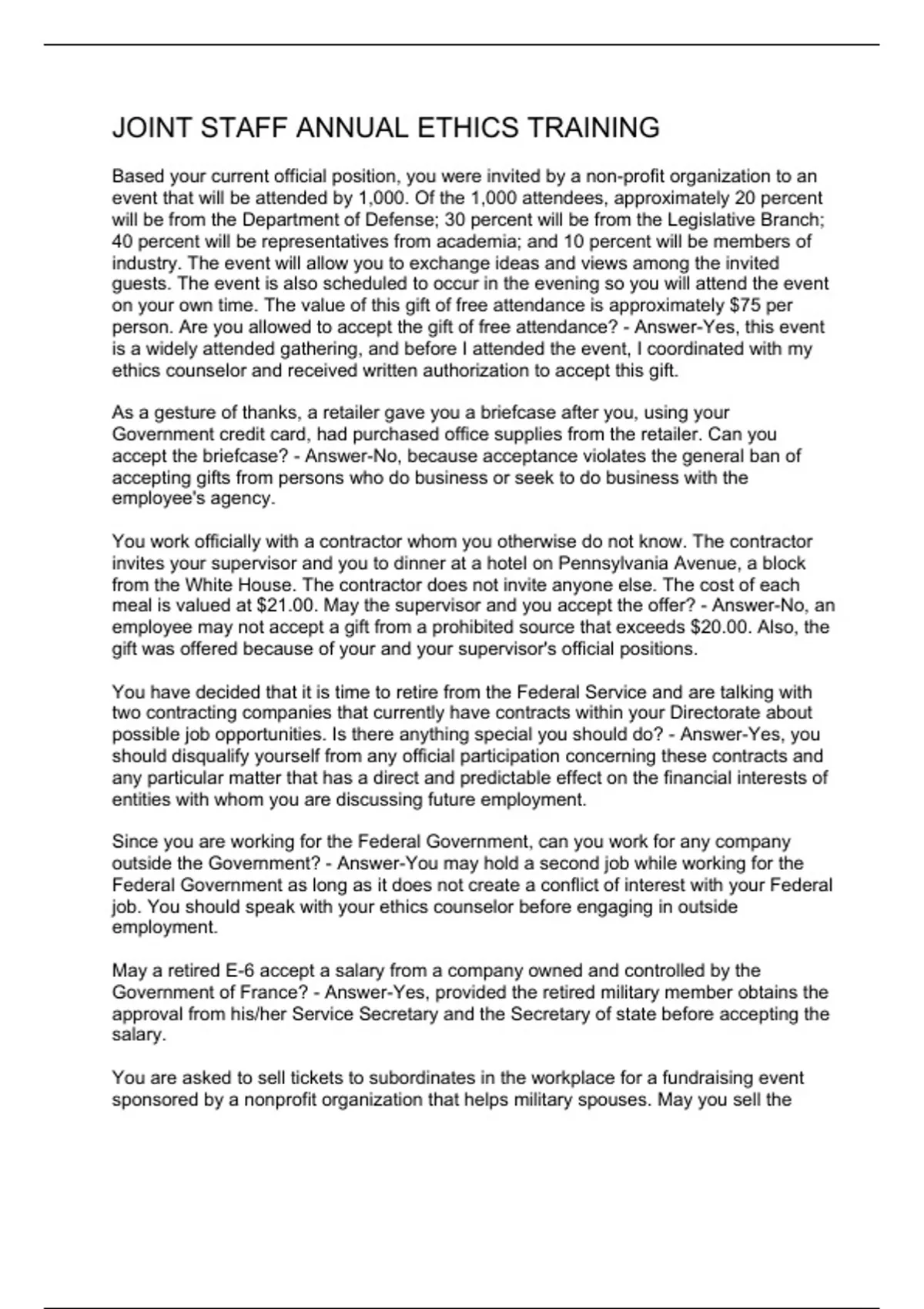 Based your current official position, you were invited by a non-profit organization to an event that will be attended by 1,000. Of the 1,000 attendees, approximately 20 percent will be from the Department of Defense; 30 percent will be from the Legislative Branch; 40 percent will be representatives from academia; and 10 percent will be members of industry. The event will allow you to exchange ideas and views among the invited guests. The event is also scheduled to occur in the evening so you will attend the event on your own time. The value of this gift of free attendance is approximately $75 per person. Are you allowed to accept the gift of free attendance? - Answer-Yes, this event is a widely attended gathering, and before I attended the event, I coordinated with my ethics counselor and received written authorization to accept this gift. As a gesture of thanks, a retailer gave you a briefcase after you, using your Government credit card, had purchased office supplies from the retailer. Can you accept the briefcase? - Answer-No, because acceptance violates the general ban of accepting gifts from persons who do business or seek to do business with the employee's agency. You work officially with a contractor whom you otherwise do not know. The contractor invites your supervisor and you to dinner at a hotel on Pennsylvania Avenue, a block from the White House. The contractor does not invite anyone else. The cost of each meal is valued at $21.00. May the supervisor and you accept the offer? - Answer-No, an employee may not accept a gift from a prohibited source that exceeds $20.00. Also, the gift was offered because of your and your supervisor's official positions. You have decided that it is time to retire from the Federal Service and are talking with two contracting companies that currently have contracts within your Directorate about possible job opportunities. Is there anything special you should do? - Answer-Yes, you should disqualify yourself from any official participation concerning these contracts and any particular matter that has a direct and predictable effect on the financial interests of entities with whom you are discussing future employment. Since you are working for the Federal Government, can you work for any company outside the Government? - Answer-You may hold a second job while working for the Federal Government as long as it does not create a conflict of interest with your Federal job. You should speak with your ethics counselor before engaging in outside employment. May a retired E-6 accept a salary from a company owned and controlled by the Government of France? - Answer-Yes, provided the retired military member obtains the approval from his/her Service Secretary and the Secretary of state before accepting the salary. You are asked to sell tickets to subordinates in the workplace for a fundraising event sponsored by a nonprofit organization that helps military spouses. May you sell the tickets? - A