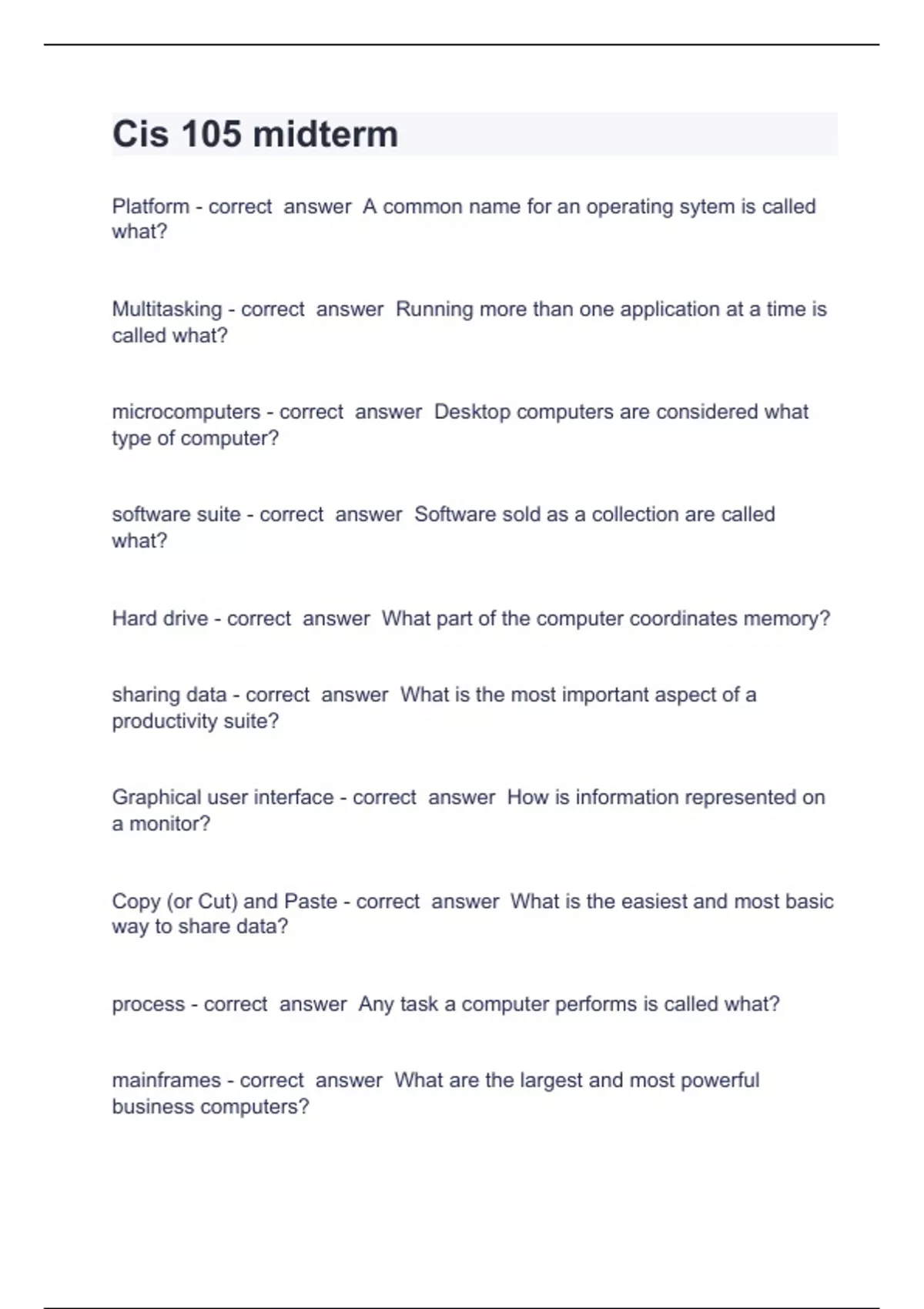 cis 105 midterm questions and answers already sol