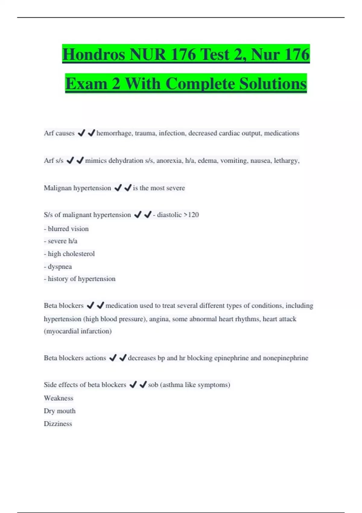 Hondros NUR 176 Test 2, Nur 176 Exam 2 With Complete Solutions Arf causes ️️hemorrhage, trauma, infection, decreased cardiac output, medications Arf s/s ️️mimics dehydration s/s, anorexia, h/a, edema, vomiting, nausea, lethargy, Malignan hypertension ️️is the most severe S/s of malignant hypertension ️️- diastolic 120 - blurred vision - severe h/a - high cholesterol - dyspnea - history of hypertension Beta blockers ️️medication used to treat several different types of conditions, including hypertension (high blood pressure), angina, some abnormal heart rhythms, heart attack (myocardial infarction)