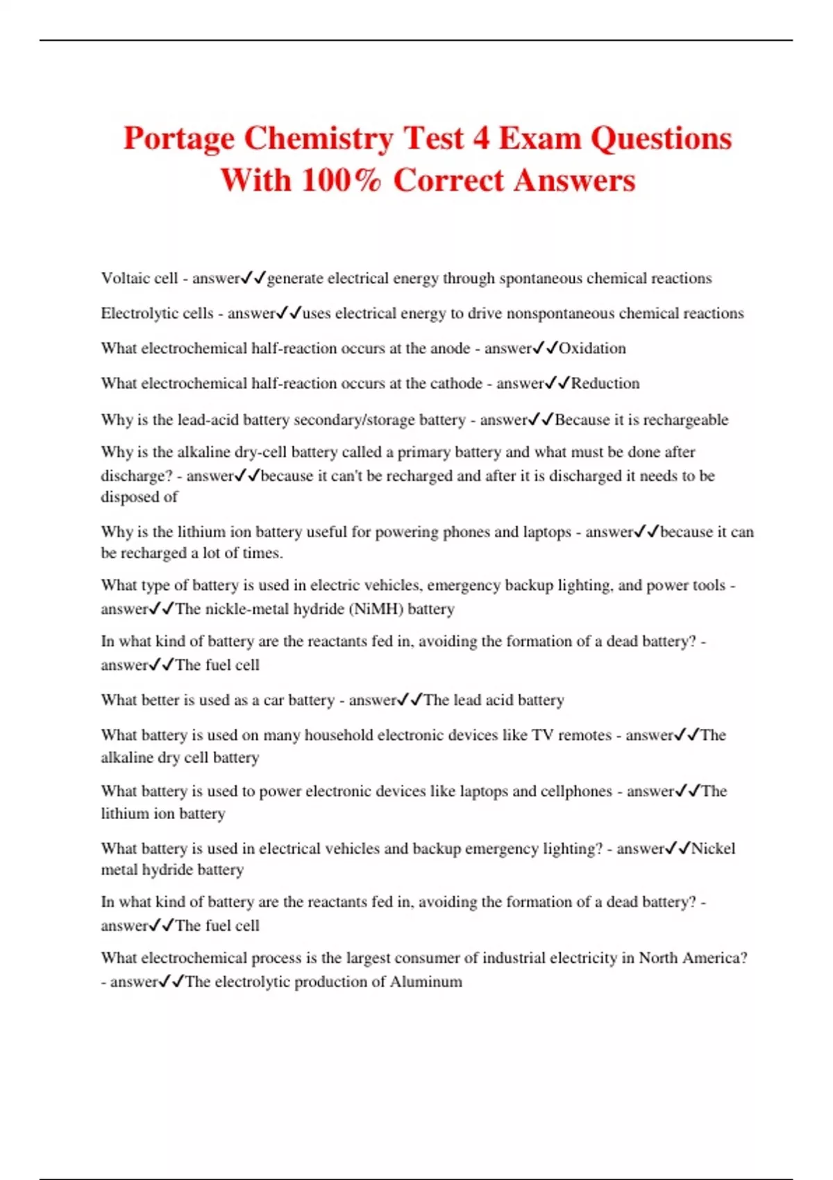 Portage Chemistry Test 4 Exam Questions With 100% Correct Answers Voltaic cell - answergenerate electrical energy through spontaneous chemical reactions Electrolytic cells - answeruses electrical energy to drive nonspontaneous chemical reactions What electrochemical half-reaction occurs at the anode - answerOxidation What electrochemical half-reaction occurs at the cathode - answerReduction Why is the lead-acid battery secondary/storage battery - answerBecause it is rechargeable Why is the alkaline dry-cell battery called a primary battery and what must be done after discharge? - answerbecause it can't be recharged and after it is discharged it needs to be disposed of Why is the lithium ion battery useful for powering phones and laptops - answerbecause it can be recharged a lot of times. What type of battery is used in electric vehicles, emergency backup lighting, and power tools - answerThe nickle-metal hydride (NiMH) battery In what kind of battery are the reactants fed in, avoiding the formation of a dead battery? - answerThe fuel cell What better is used as a car battery - answerThe lead acid battery What battery is used on many household electronic devices like TV remotes - answerThe alkaline dry cell battery What battery is used to power electronic devices like laptops and cellphones - answerThe lithium ion battery What battery is used in electrical vehicles and backup emergency lighting? - answerNickel metal hydride battery In what kind of battery are the reactants fed in, avoiding the formation of a dead battery? - answerThe fuel cell What electrochemical process is the largest consumer of industrial electricity in North America? - answerThe electrolytic production of Aluminum