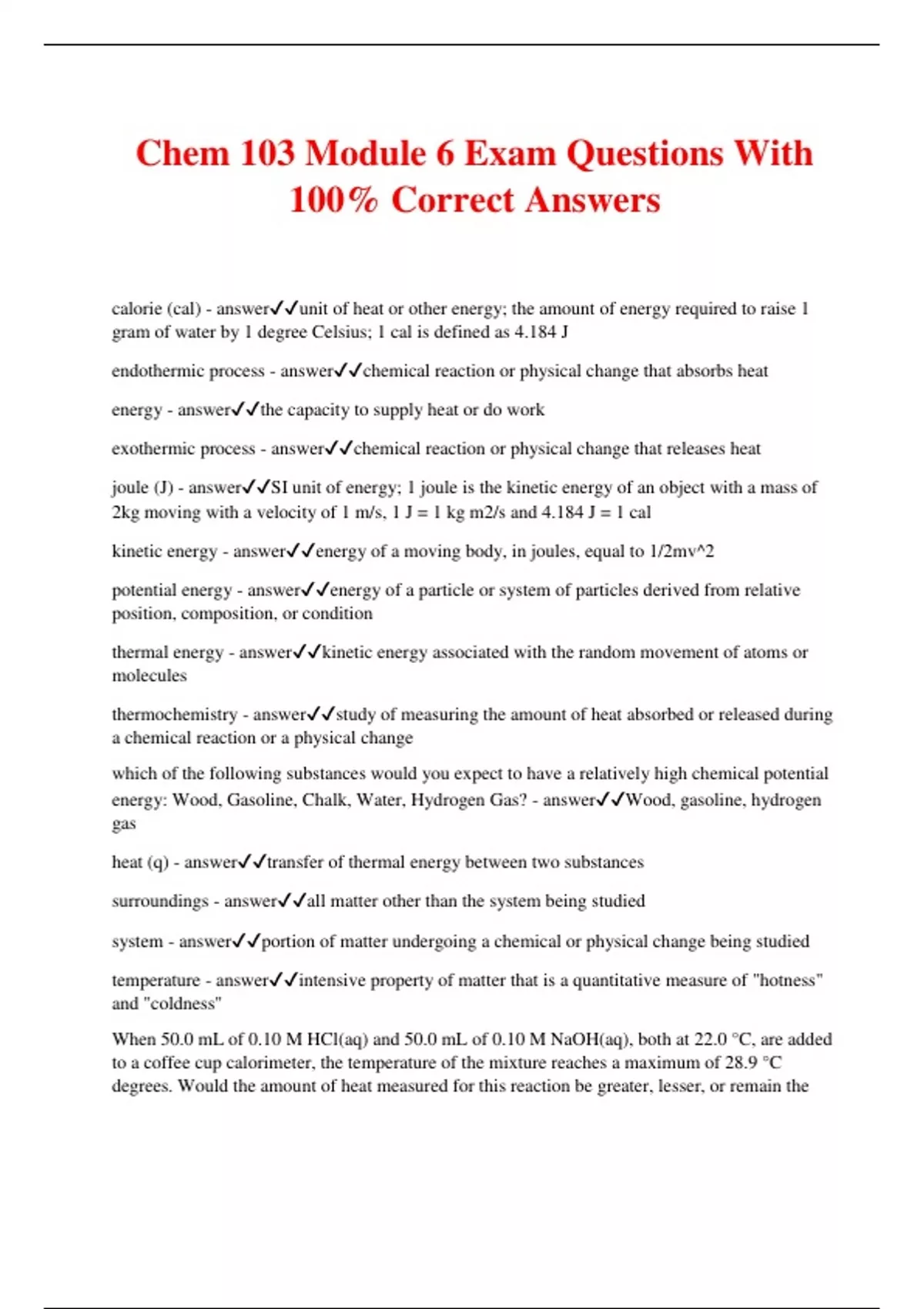 Chem 103 Module 6 Exam Questions With 100% Correct Answers calorie (cal) - answerunit of heat or other energy; the amount of energy required to raise 1 gram of water by 1 degree Celsius; 1 cal is defined as 4.184 J endothermic process - answerchemical reaction or physical change that absorbs heat energy - answerthe capacity to supply heat or do work exothermic process - answerchemical reaction or physical change that releases heat joule (J) - answerSI unit of energy; 1 joule is the kinetic energy of an object with a mass of 2kg moving with a velocity of 1 m/s, 1 J = 1 kg m2/s and 4.184 J = 1 cal kinetic energy - answerenergy of a moving body, in joules, equal to 1/2mv^2 potential energy - answerenergy of a particle or system of particles derived from relative position, composition, or condition