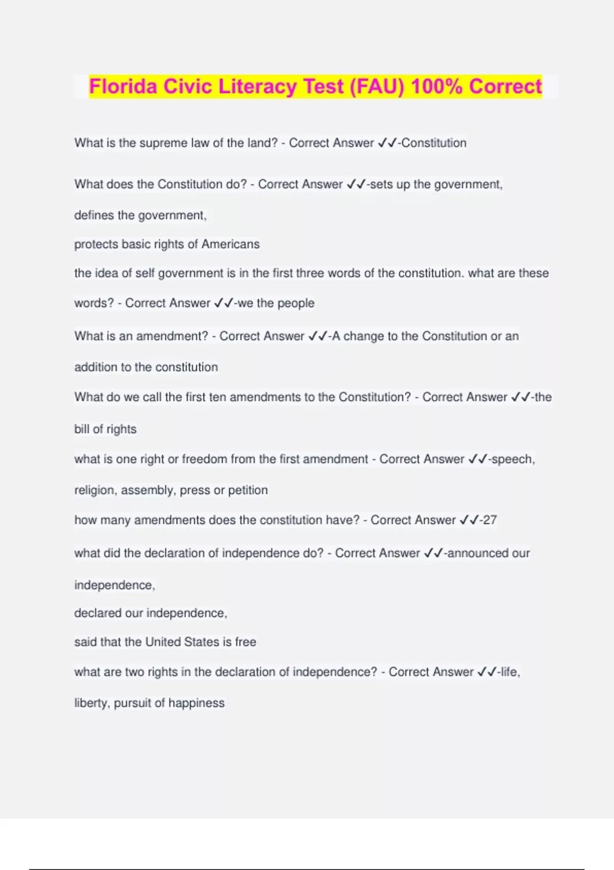 Florida Civic Literacy Test (FAU) 100% Correct What is the supreme law of the land? - Correct Answer ️️ -Constitution What does the Constitution do? - Correct Answer ️️ -sets up the government, defines the government, protects basic rights of Americans the idea of self government is in the first three words of the constitution. what are these words? - Correct Answer ️️ -we the people What is an amendment? - Correct Answer ️️ -A change to the Constitution or an addition to the constitution What do we call the first ten amendments to the Constitution? - Correct Answer ️️ -the bill of rights what is one right or freedom from the first amendment - Correct Answer ️️ -speech, religion, assembly, press or petition how many amendments does the constitution have? - Correct Answer ️️ -27 what did the declaration of independence do? - Correct Answer ️️ -announced our independence, declared our independence, said that the United States is free what are two rights in the declaration of independence? - Correct Answer ️️ -life, liberty, pursuit of happiness What is freedom of religion? - Correct Answer ️️ -you can practice any religion, or not practice a religion what is the economic system in the United States? - Correct Answer ️️ -cabalist and market economy What is the "rule of law"? - Correct Answer ️️ -Everyone must follow the law, Leaders must obey the law, Government must obey the law, No one is above the law. name a branch or part of the government? - Correct Answer ️️ -Congress legislative President executive the courts judicial What stops one branch of government from becoming too powerful? - Correct Answer ️️ -checks and balances, and separation of powers who is in charge of the executive branch? - Correct Answer ️️ -president who makes federal laws - Correct Answer ️️ -Congress, Senate and House (of Representatives), (U.S. or national) legislature How many U.S. Senators are there? - Correct Answer ️️ -100 What are the two parts of the U.S. Congress? - Correct Answer ️️ -Senate and House of Representatives we elect a us senator for how many years? - Correct Answer ️️ -6 Who is one of your state's U.S. Senators now? - Correct Answer ️️ -Rick Scott The House of Representatives has how many voting members? - Correct Answer ️️ - 435 Name your U.S. Representative. - Correct Answer ️️ -Brian mast Who does a U.S. Senator represent? - Correct Answer ️️ -all people of the state Why do some states have more Representatives than ot