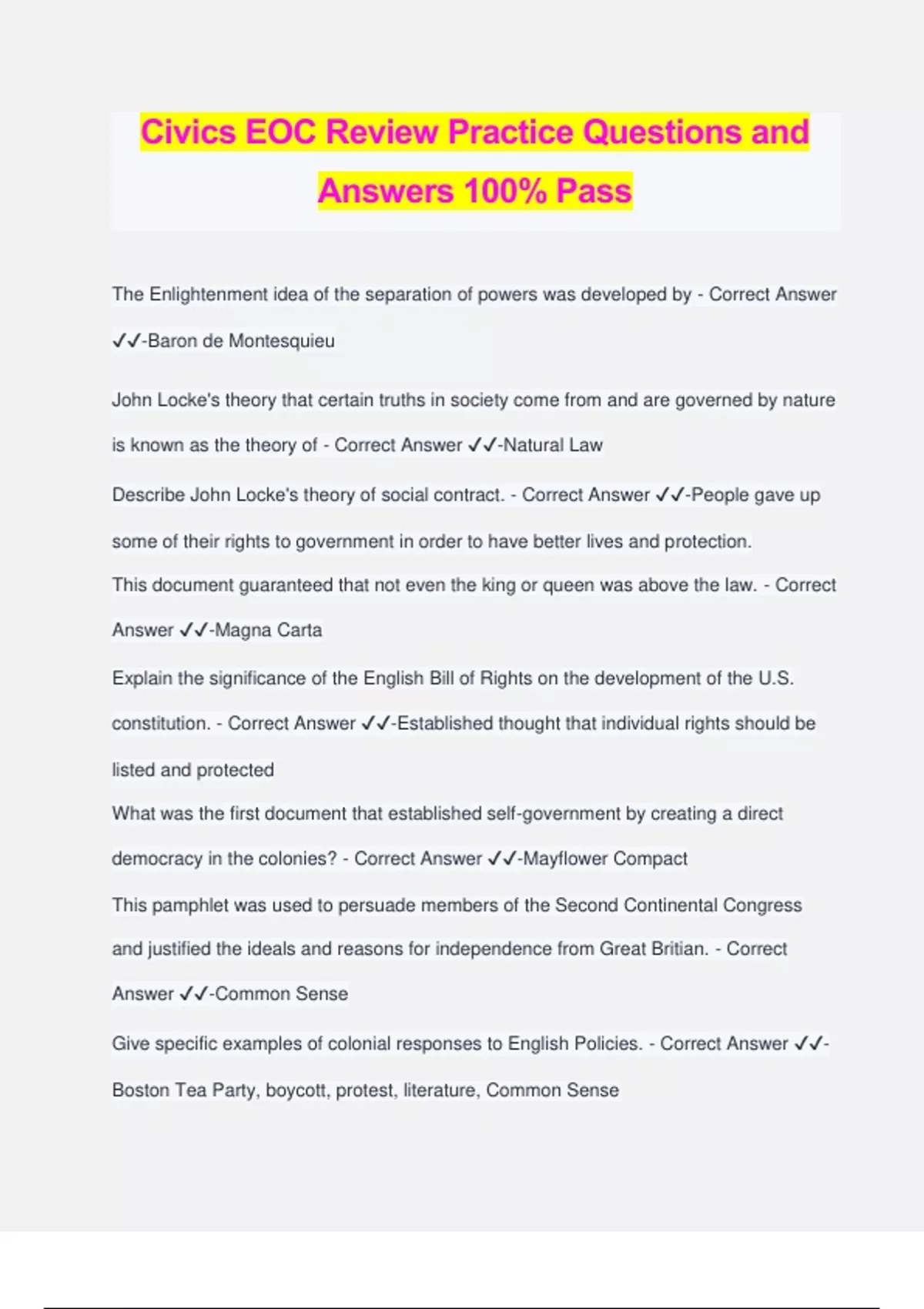 Civics EOC Review Practice Questions and Answers 100% Pass The Enlightenment idea of the separation of powers was developed by - Correct Answer ️️ -Baron de Montesquieu John Locke's theory that certain truths in society come from and are governed by nature is known as the theory of - Correct Answer ️️ -Natural Law Describe John Locke's theory of social contract. - Correct Answer ️️ -People gave up some of their rights to government in order to have better lives and protection. This document guaranteed that not even the king or queen was above the law. - Correct Answer ️️ -Magna Carta Explain the significance of the English Bill of Rights on the development of the U.S. constitution. - Correct Answer ️️ -Established thought that individual rights should be listed and protected What was the first document that established self-government by creating a direct democracy in the colonies? - Correct Answer ️️ -Mayflower Compact This pamphlet was used to persuade members of the Second Continental Congress and justified the ideals and reasons for independence from Great Britian. - Correct Answer ️️ -Common Sense Give specific examples of colonial responses to English Policies. - Correct Answer ️️ - Boston Tea Party, boycott, protest, literature, Common Sense What concerns of the colonists led to the writing of the Declaration of Independence? - Correct Answer ️️ -Taxation without respresentation, forced quartering violation of BR What were the main complaints/arguments against Britian in the Declaration of Independence? - Correct Answer ️️ -Colonists felt that England was not protecting their rights, taxing without representation, abusing power John Locke's theory of ___________ guaranteed that all individuals are entitled to basic rights such as life, liberty, and property. - Correct Answer ️️ -Natural Rights Which document outlined the first form of government for the United States? Which system of government did this document create? - Correct Answer ️️ -Articles of Confederation, a confederal system (no central government) List some of the major weaknesses of the Articles of Confederation. - Correct Answer ️️ -Central government had no power to tax, no national court system, no executive branch, no power to enforce laws, no power to regulate trade, all 13 states were needed to approve an amendment, approval of 9 of 13 states to enact laws What is the purpose of the Preamble to the constitution? - Correct Answer ️️ -It introduces the goals and concepts outlined in the constitution + reinforces principles of good government What was the main argument the Federalists used to support the ratification of the Constitution? - Correct Answer ️️ -The need for a stronger government List the arguments the Anti-Federalists used against ratifying the Constitution. - Correct Answer ️️ -No bill of rights, central government too strong A legal member of a country is a - Correct Answer ️️ -Citizen Name two ways a person can become a U.S. citizen - Correct Answer ️️ -Birth to citizen parent called Law of Blood; Birth in US or US territory called Law of Soil; or naturalization List the steps in the naturalization process. - Correct Answer ️️ -apply for residency visa, wait 5 years, apply for citizenship status, finger printed, interview with Immigration Services , pass citizenship test, take oath What are the major differences between Democrats and Republicans? - Correct Answer ️️ -Democrats believe in a large government, encouraging government involvement with many programs . Republicans believe in a small government with few programs, encouraging communities and charities to take care of their own neighbors and families. What is a plank? - Correct Answer ️️ -A specific issue that is a part of a parties' platform. A dock is a platform, the planks are the individual boards. The platform is the big theme, the plank is the individual idea. i.e. helping the poor people is