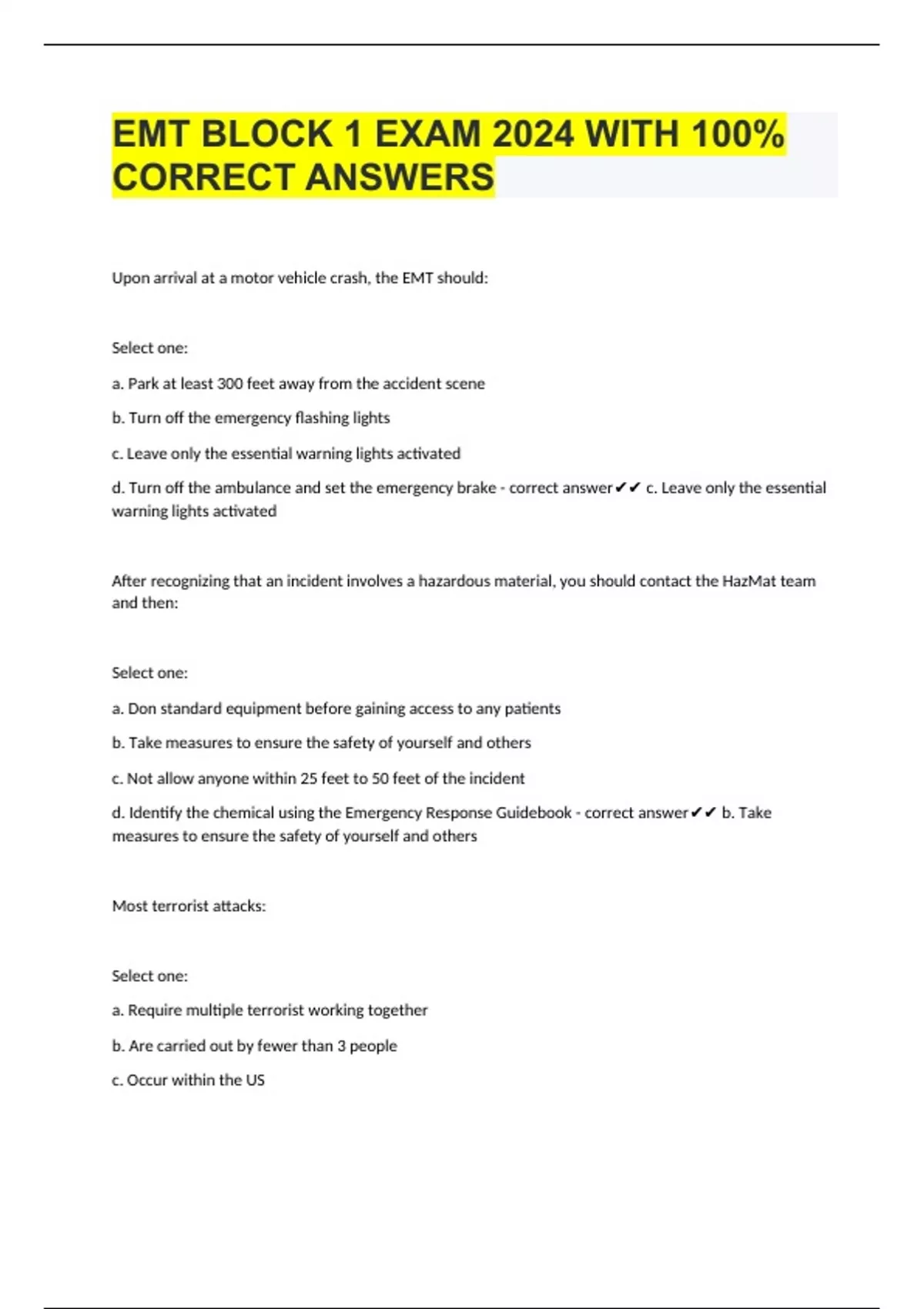 EMT BLOCK 1 EXAM 2024 WITH 100% CORRECT ANSWERS Upon arrival at a motor vehicle crash, the EMT should: Select one: a. Park at least 300 feet away from the accident scene b. Turn off the emergency flashing lights c. Leave only the essential warning lights activated d. Turn off the ambulance and set the emergency brake - correct answer c. Leave only the essential warning lights activated After recognizing that an incident involves a hazardous material, you should contact the HazMat team and then: Select one: a. Don standard equipment before gaining access to any patients b. Take measures to ensure the safety of yourself and others c. Not allow anyone within 25 feet to 50 feet of the incident d. Identify the chemical using the Emergency Response Guidebook - correct answer b. Take measures to ensure the safety of yourself and others Most terrorist attacks: