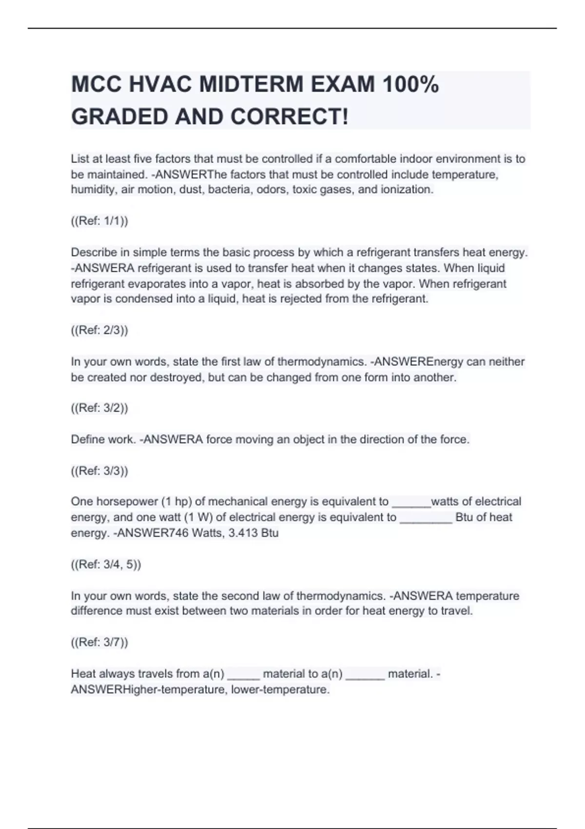 List at least five factors that must be controlled if a comfortable indoor environment is to be maintained. -ANSWERThe factors that must be controlled include temperature, humidity, air motion, dust, bacteria, odors, toxic gases, and ionization. ((Ref: 1/1)) Describe in simple terms the basic process by which a refrigerant transfers heat energy. -ANSWERA refrigerant is used to transfer heat when it changes states. When liquid refrigerant evaporates into a vapor, heat is absorbed by the vapor. When refrigerant vapor is condensed into a liquid, heat is rejected from the refrigerant. ((Ref: 2/3)) In your own words, state the first law of thermodynamics. -ANSWEREnergy can neither be created nor destroyed, but can be changed from one form into another. ((Ref: 3/2)) Define work. -ANSWERA force moving an object in the direction of the force. ((Ref: 3/3))