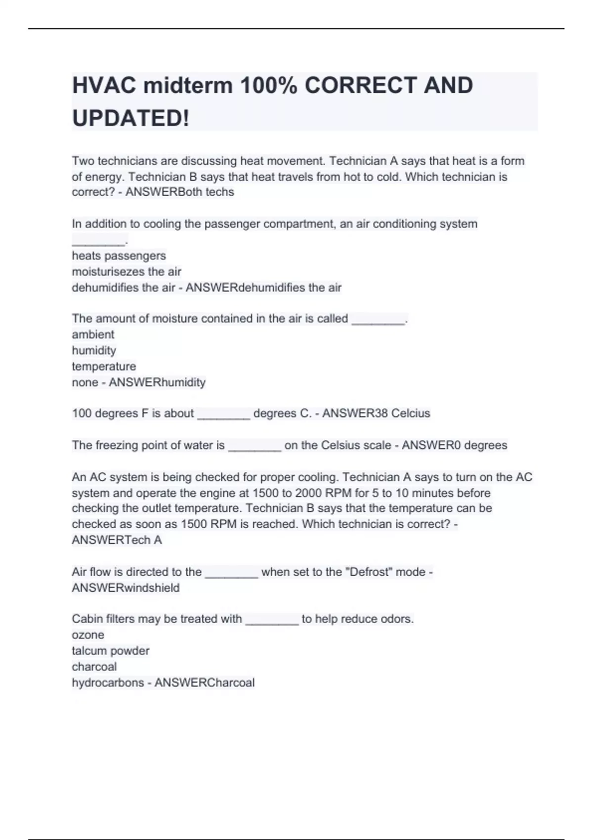 Two technicians are discussing heat movement. Technician A says that heat is a form of energy. Technician B says that heat travels from hot to cold. Which technician is correct? - ANSWERBoth techs In addition to cooling the passenger compartment, an air conditioning system ________. heats passengers moisturisezes the air dehumidifies the air - ANSWERdehumidifies the air The amount of moisture contained in the air is called ________. ambient humidity temperature none - ANSWERhumidity 100 degrees F is about ________ degrees C. - ANSWER38 Celcius The freezing point of water is ________ on the Celsius scale - ANSWER0 degrees An AC system is being checked for proper cooling. Technician A says to turn on the AC system and operate the engine at 1500 to 2000 RPM for 5 to 10 minutes before checking the outlet temperature. Technician B says that the temperature can be checked as soon as 1500 RPM is reached.