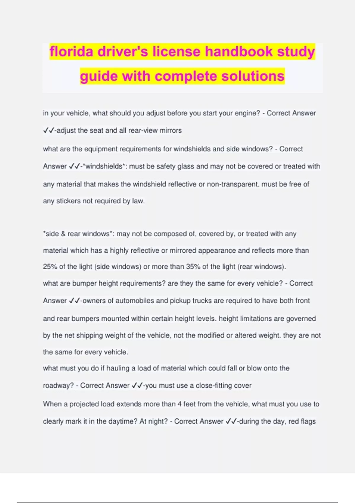 florida driver's license handbook study guide with complete solutions in your vehicle, what should you adjust before you start your engine? - Correct Answer ️️ -adjust the seat and all rear-view mirrors what are the equipment requirements for windshields and side windows? - Correct Answer ️️ -*windshields*: must be safety glass and may not be covered or treated with any material that makes the windshield reflective or non-transparent. must be free of any stickers not required by law. *side & rear windows*: may not be composed of, covered by, or treated with any material which has a highly reflective or mirrored appearance and reflects more than 25% of the light (side windows) or more than 35% of the light (rear windows). what are bumper height requirements? are they the same for every vehicle? - Correct Answer ️️ -owners of automobiles and pickup trucks are required to have both front and rear bumpers mounted within certain height levels. height limitations are governed by the net shipping weight of the vehicle, not the modified or altered weight. they are not the same for every vehicle. what must you do if hauling a load of material which could fall or blow onto the roadway? - Correct Answer ️️ -you must use a close-fitting cover When a projected load extends more than 4 feet from the vehicle, what must you use to clearly mark it in the daytime? At night? - Correct Answer ️️ -during the day, red flags at least 18 inches square must mark the extremities of the load. at night, requirements include red lamps or red reflectors that can be seen from afar. why is drowsy driving dangerous? - Correct Answer ️️ -slow down thoughts & reaction time, affect judgment and vision, impair senses and abilities, can cause nodding off or falling asleep What should you do if another driver is threatening you or intentionally driving dangerously around you? - Correct Answer ️️ -remain calm and try to put as much distance between you and them as possible. slow down and let them pass. do not provoke the driver. What are the three main categories of distracted driving? - Correct Answer ️️ -visual, manual, cognitive Why is texting one of the most dangerous distracted driving behaviors? - Correct Answer ️️ -texting involves all 3 categories of distractions Can anyone drink and drive safely? - Correct Answer ️️ -no Both your judgment and vision are affected after drinking alcohol. Which is affected first? - Correct Answer ️️ -judgement is affected first What can happen to you if you were in a crash and not wearing a seatbelt? - Correct Answer ️️ -can be ejected from the vehicle, can be thrown against its interior objects, or death What age are children required to be in a car seat? In a car seat or booster seat? - Correct Answer ️️ -children under age of 4 must be in a safety seat, and children ages 4 and 5 must be in either a safety seat or booster seat. If a law enforcement officer stops a vehicle and the front seat passenger under 18 years old is not wearing a safety belt, who will be charged with a seatbelt violation? - Correct Answer ️️ -the driver What does a single broken white line on the highway mean? - Correct Answer ️️ -you may cross this line to change lanes when it's safe to do so What does a double solid yellow line in the center of the highway mean? A double solid white line? - Correct Answer ️️ -double solid yellow: vehicles travelling in either direction must not pass the lines unless turning left double solid white: changing lanes is not allowed What does a solid yellow line to the right of the centerline of the highway mean? - Correct Answer ️️ -no crossing What do the colors of traffic signs indicate (red, orange, yellow, etc.)? - Correct Answer ️️ -red: stop, do not enter, wrong way, yield orange: construction/maintenance warning yellow: general warning bright yellow: school, pedestrian, bicycling activity warning white/black: give commands, control traffic green: directional information blue: traveling guidance/parking space for disabled drivers brown: areas of recreation/historical significance When more than one vehicle approaches a four-way stop sign, which one moves first? - Correct Answer ️️ -the first vehicle to arrive at the intersection first may move forward first What does a red traffic light mean? What does a flashing red traffic light mean? - Correct Answer ️️ -a red light means come to a complete stop. a flashing red light means the same thing as a stop sign. after a full stop at a red traffic light, when may a driver turn right? - Correct Answer ️️ - you may turn right if there is no NO TURN ON RED sign and the way is clear what does a green arrow showing at the same time as a red traffic light mean you can do? - Correct Answer ️️ -it you are in the proper lane for such a turn, you may go whilst yielding right-of-way vehicles and pedestrians what happens to the force of impact when you double your speed? triple your speed? - Correct Answer ️️ -doubling speed means breaking distance and impact are 4 times greater tripling the speed means the breaking distance and impact are 9 times greater unless otherwise posted, what is the speed limit for cars in a residential area? - Correct Answer ️️ -30 mph What is the maximum speed limit on a limited access highway? - Correct Answer ️️ - 70 mph except where otherwise posted Can you be issued a citation for driving too slowly? - Correct Answer ️️ -yes What are the steps for making a smooth stop? - Correct Answer ️️ -check mirrors and blind spots for traffic to the rear