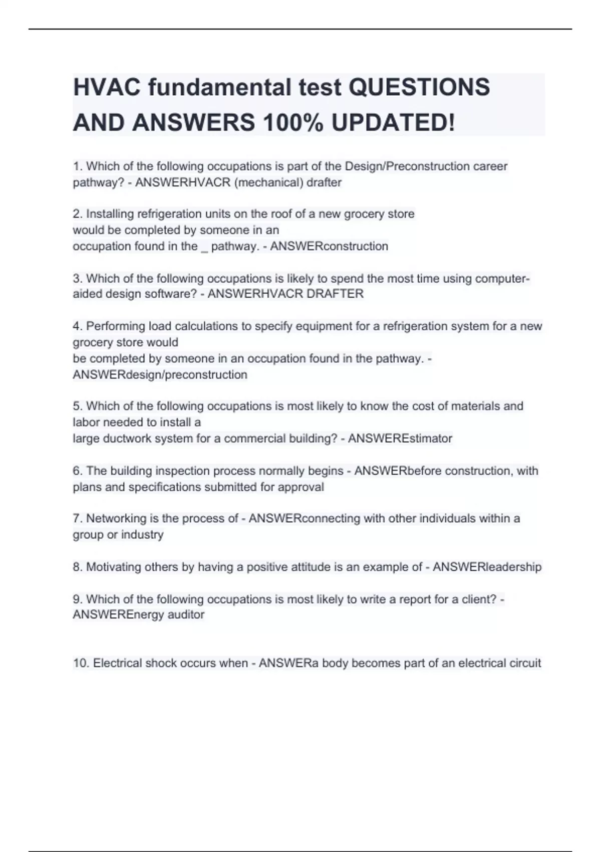 1. Which of the following occupations is part of the Design/Preconstruction career pathway? - ANSWERHVACR (mechanical) drafter 2. Installing refrigeration units on the roof of a new grocery store would be completed by someone in an occupation found in the _ pathway. - ANSWERconstruction 3. Which of the following occupations is likely to spend the most time using computer-aided design software? - ANSWERHVACR DRAFTER 4. Performing load calculations to specify equipment for a refrigeration system for a new grocery store would be completed by someone in an occupation found in
