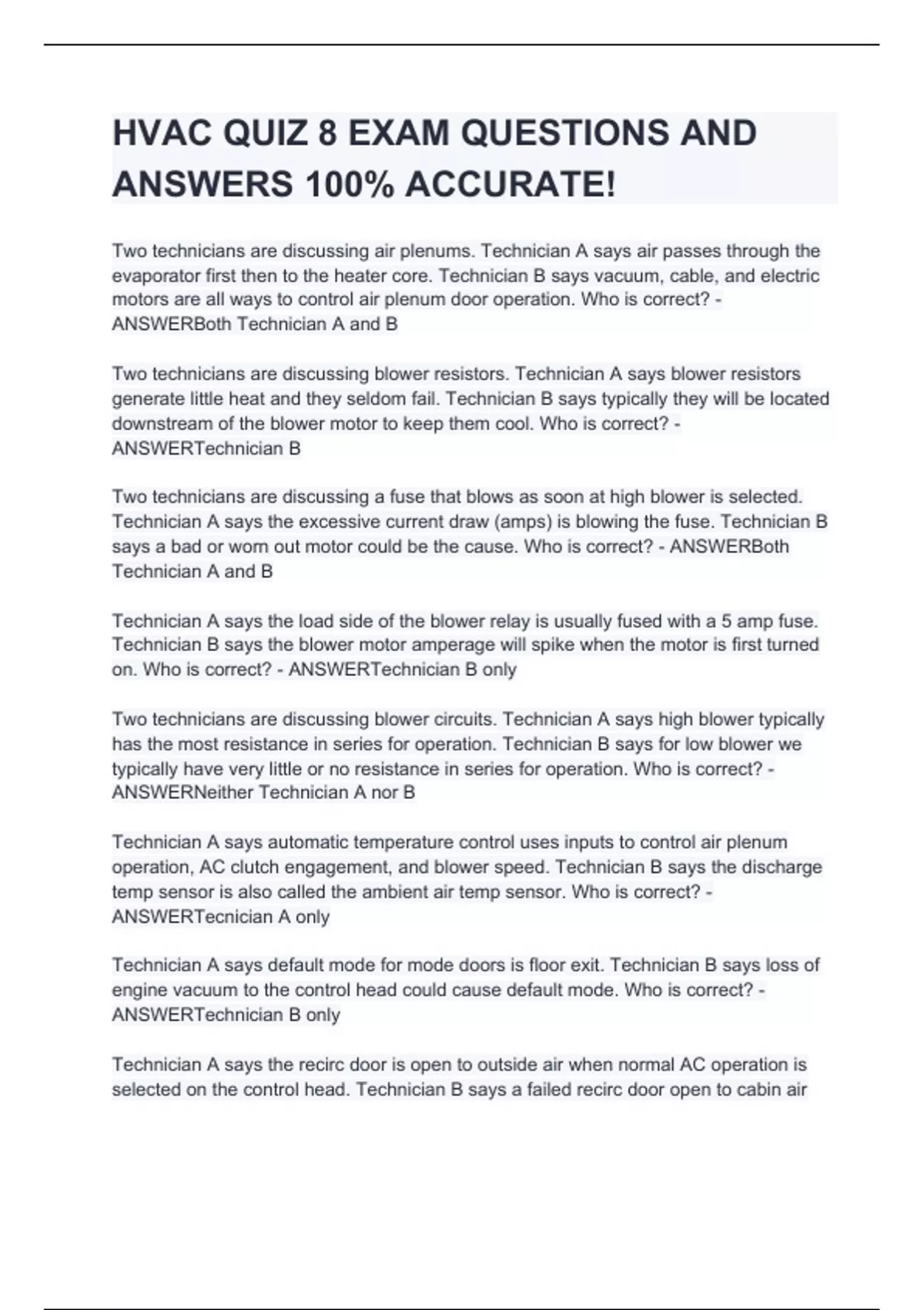 Two technicians are discussing air plenums. Technician A says air passes through the evaporator first then to the heater core. Technician B says vacuum, cable, and electric motors are all ways to control air plenum door operation. Who is correct? - ANSWERBoth Technician A and B Two technicians are discussing blower resistors. Technician A says blower resistors generate little heat and they seldom fail. Technician B says typically they will be located downstream of the blower motor to keep them cool. Who is correct? - ANSWERTechnician B Two technicians are discussing a fuse that blows as soon at high blower is selected. Technician A says the excessive current draw (amps) is blowing the fuse. Technician B says a bad or worn out motor could be the cause. Who is correct? - ANSWERBoth