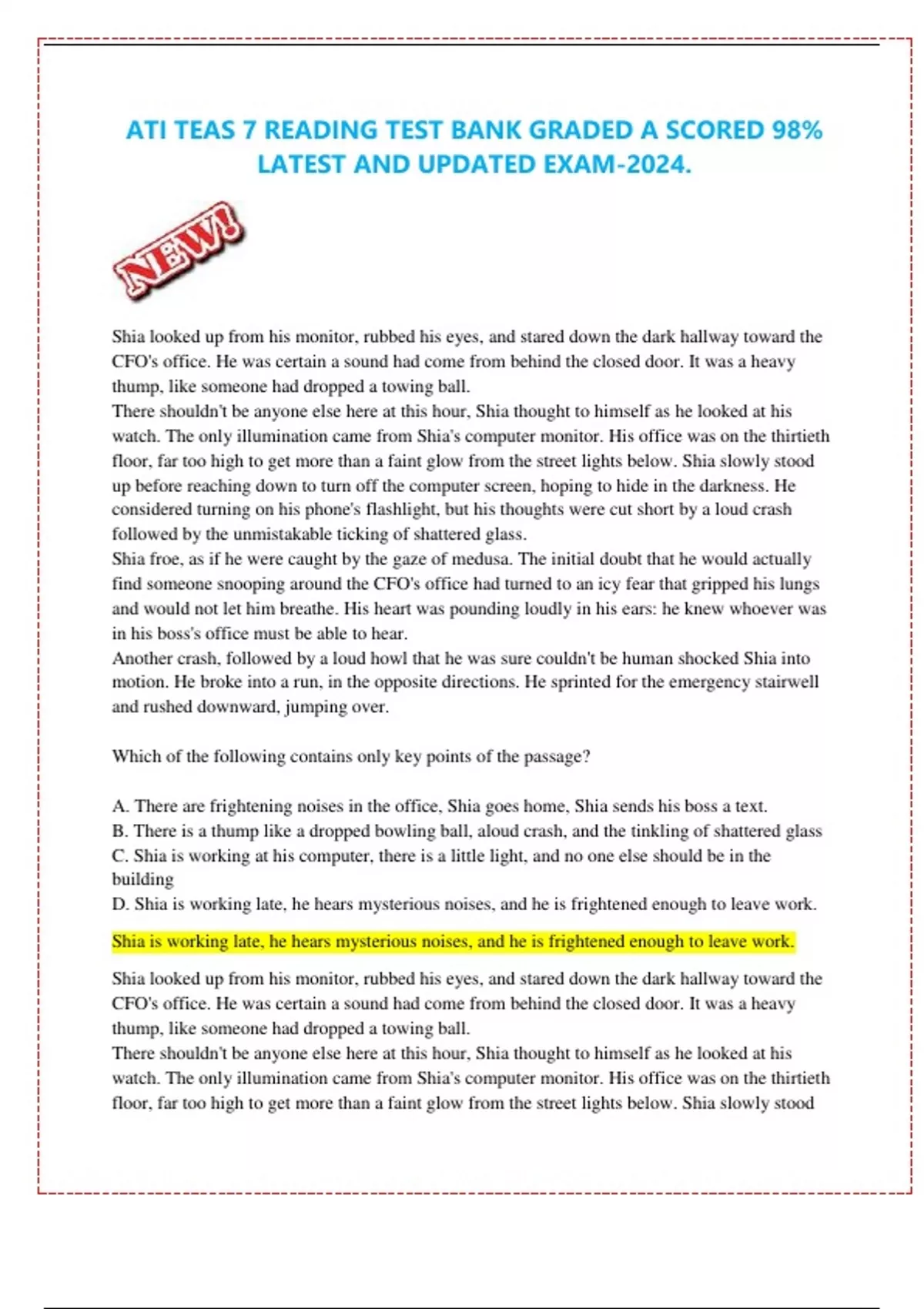 ATI TEAS 7 READING TEST BANK GRADED A SCORED 98% LATEST AND UPDATED EXAM-2024.