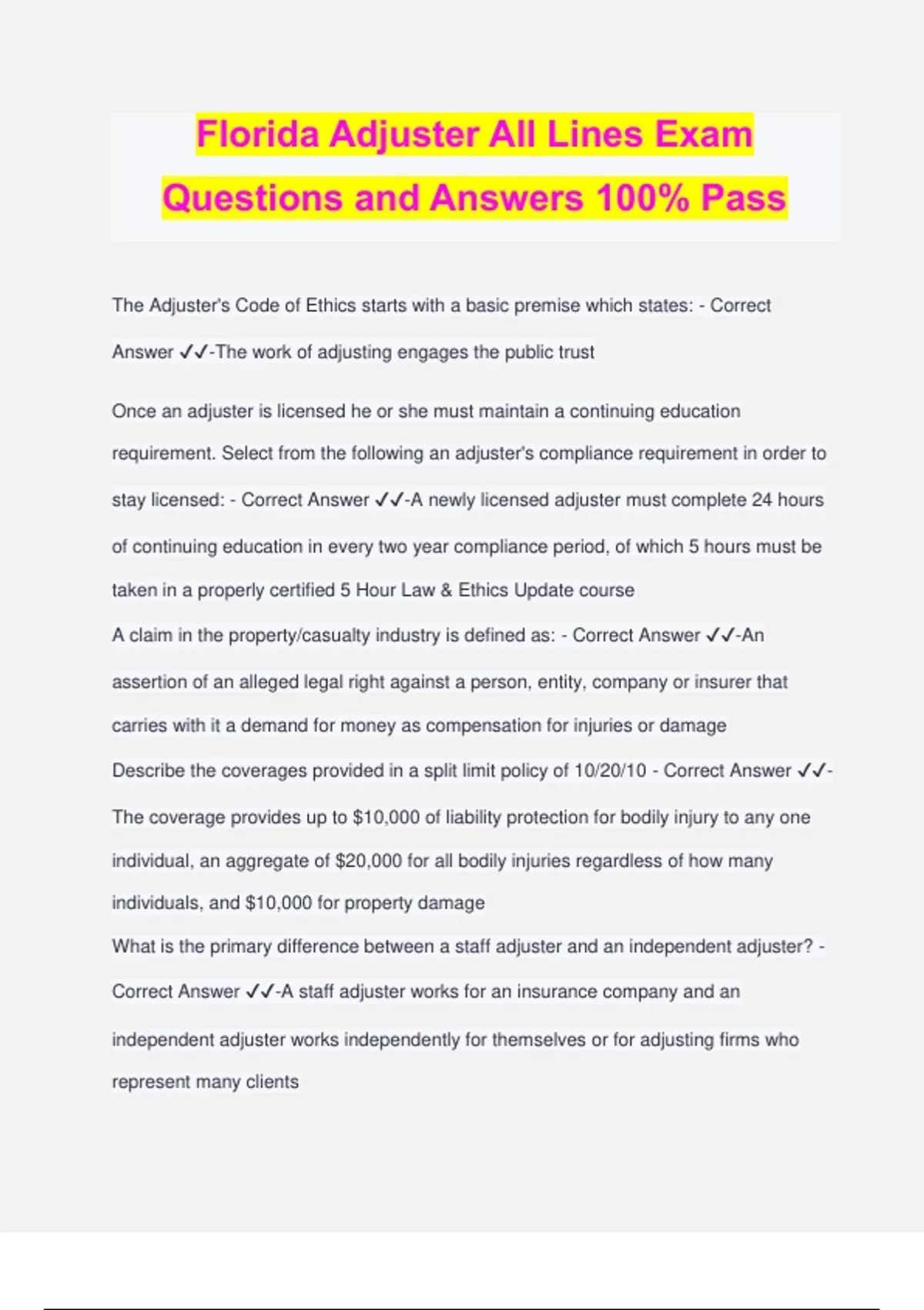 Florida Adjuster All Lines Exam Questions and Answers 100% Pass The Adjuster's Code of Ethics starts with a basic premise which states: - Correct Answer ️️ -The work of adjusting engages the public trust Once an adjuster is licensed he or she must maintain a continuing education requirement. Select from the following an adjuster's compliance requirement in order to stay licensed: - Correct Answer ️️ -A newly licensed adjuster must complete 24 hours of continuing education in every two year compliance period, of which 5 hours must be taken in a properly certified 5 Hour Law & Ethics Update course A claim in the property/casualty industry is defined as: - Correct Answer ️️ -An assertion of an alleged legal right against a person, entity, company or insurer that carries with it a demand for money as compensation for injuries or damage Describe the coverages provided in a split limit policy of 10/20/10 - Correct Answer ️️ - The coverage provides up to $10,000 of liability protection for bodily injury to any one individual, an aggregate of $20,000 for all bodily injuries regardless of how many individuals, and $10,000 for property damage What is the primary difference between a staff adjuster and an independent adjuster? - Correct Answer ️️ -A staff adjuster works for an insurance company and an independent adjuster works independently for themselves or for adjusting firms who represent many clients