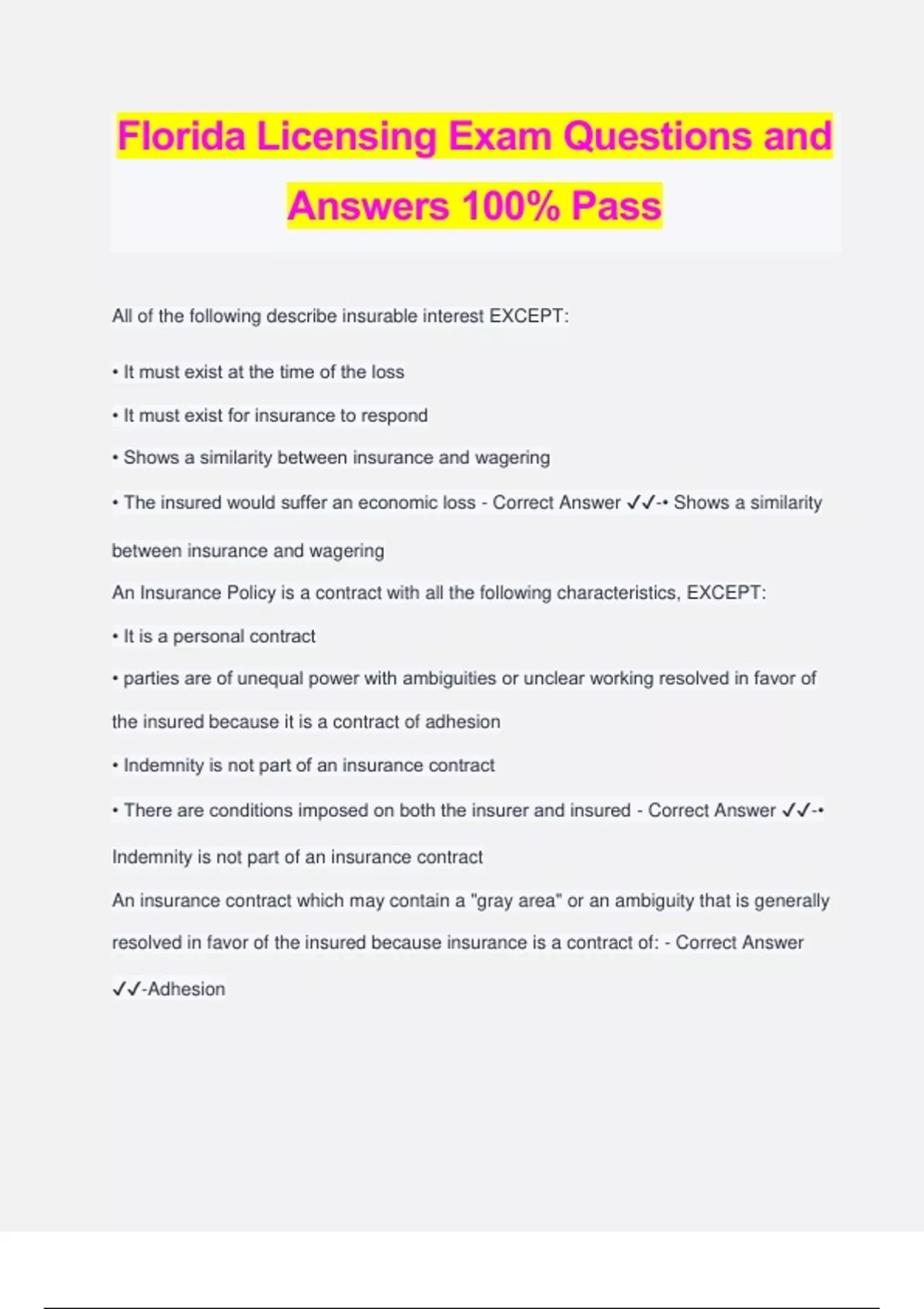 Florida Licensing Exam Questions and Answers 100% Pass All of the following describe insurable interest EXCEPT: • It must exist at the time of the loss • It must exist for insurance to respond • Shows a similarity between insurance and wagering • The insured would suffer an economic loss - Correct Answer ️️ -• Shows a similarity between insurance and wagering An Insurance Policy is a contract with all the following characteristics, EXCEPT: • It is a personal contract • parties are of unequal power with ambiguities or unclear working resolved in favor of the insured because it is a contract of adhesion • Indemnity is not part of an insurance contract • There are conditions imposed on both the insurer and insured - Correct Answer ️️ -• Indemnity is not part of an insurance contract An insurance contract which may contain a "gray area" or an ambiguity that is generally resolved in favor of the insured because insurance is a contract of: - Correct Answer ️️ -Adhesion If an insured sells his car to another person, the buyer may be prohibited from also receiving the insured's policy. This is because the insurance contract is a contract of: - Correct Answer ️️ -Personal nature Strict or absolute liability - Correct Answer ️️ -Is assigned by law or statute Jack and Connie agree to have Jack burn down Connie's house for $10,000. What element of a valid contract is missing? - Correct Answer ️️ -Legal Purpose Risks that are insurable are - Correct Answer ️️ -Pure risks Insurance that covers the responsibility for loss arising out of negligence that results in payment to a party other than the insured is: - Correct Answer ️️ -Liability Insurance The goal of insurance is to restore the insured to the same economic position as before the covered loss, this is the principle of - Correct Answer ️️ -Indemnity All of the following are ways that liability limits can be expressed except: • PIP Limit • Aggregate Limit • Split Limit • Single Limit - Correct Answer ️️ -PIP Limit An insured has A SPLIT limit liability policy with 10/20/10 limits. He owes the following people liability bodily injuries claims of: Passenger 1 = $12,000, Passenger 2 = $10,000, Passenger 3 = $18,000. How much liability insurance will his policy pay for these claims? - Correct Answer ️️ -$20,000 If a lender has an insurable interest in an auto, because of the money loaned to finance the purchase, the lender would appear on the policy as the: • Lessee • Loss Payee • Mortgagor • Mortgagee - Correct Answer ️️ -Loss Payee To turn partially damaged property over to the insurance company and ask them