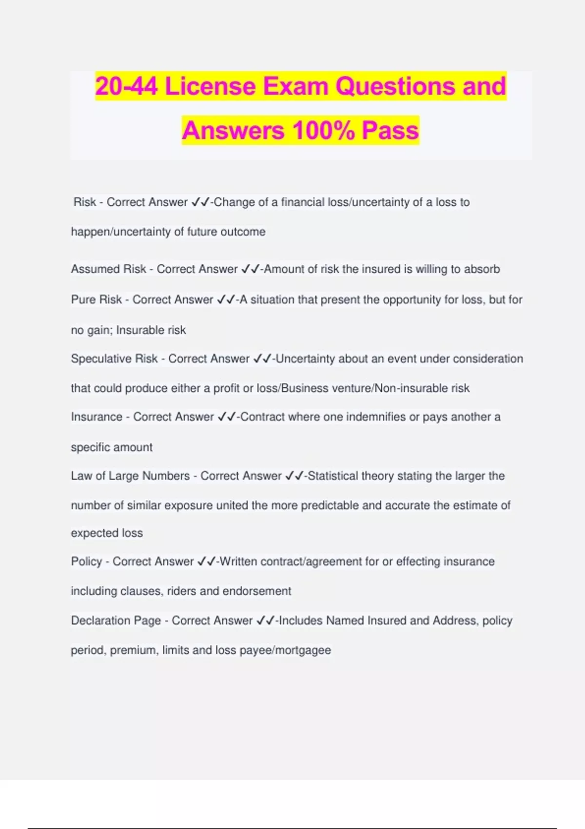 20-44 License Exam Questions and Answers 100% Pass Risk - Correct Answer ️️ -Change of a financial loss/uncertainty of a loss to happen/uncertainty of future outcome Assumed Risk - Correct Answer ️️ -Amount of risk the insured is willing to absorb Pure Risk - Correct Answer ️️ -A situation that present the opportunity for loss, but for no gain; Insurable risk Speculative Risk - Correct Answer ️️ -Uncertainty about an event under consideration that could produce either a profit or loss/Business venture/Non-insurable risk Insurance - Correct Answer ️️ -Contract where one indemnifies or pays another a specific amount Law of Large Numbers - Correct Answer ️️ -Statistical theory stating the larger the number of similar exposure united the more predictable and accurate the estimate of expected loss Policy - Correct Answer ️️ -Written contract/agreement for or effecting insurance including clauses, riders and endorsement Declaration Page - Correct Answer ️️ -Includes Named Insured and Address, policy period, premium, limits and loss payee/mortgagee Insuring Agreement - Correct Answer ️️ -Portion of the insurance policy in which the Insurer(Insurance Company) promises to make payment for covered perils to or on behalf of the insured Conditional Contract - Correct Answer ️️ -Obligation of the insurer (Insurance Company) may be based on insured satisfying certain conditions Exclusions - Correct Answer ️️ -Section of policy which lists property, perils, losses, persons or situations which are not covered Endorsement - Correct Answer ️️ -Written form attached to an insurance policy that alters the policy's coverage, terms, or conditions Binders - Correct Answer ️️ -Temporary insurance/ Can be written or oral Certificate of Insurance - Correct Answer ️️ -Document providing evidence that certain types of insurance coverages and limits have been purchased by the insured Contract of Adhesion - Correct Answer ️️ -Contract created by insurance company - insured cannot negotiate terms Unilateral Contract - Correct Answer ️️ -Contract where only one party makes an enforceable promise Personal Contract - Correct Answer ️️ -Covers the financial loss suffered by a person - not the property or operations Definition of Insured - Correct Answer ️️ -Any person/organization specifically designated by name as an insured in an insurance policy, as well as others, that although unnamed, fall within policy definition Insurable Interest - Correct Answer ️️ -One who has an economic interest Limits of Liability - Correct Answer ️️ -Maximum amount of insurance the company will pay for a particular loss Casualty Insurance - Correct Answer ️️ -All insurance other than Life & Health Property Insurance - Correct Answer ️️ -Carrier pays directly to the insured/First
