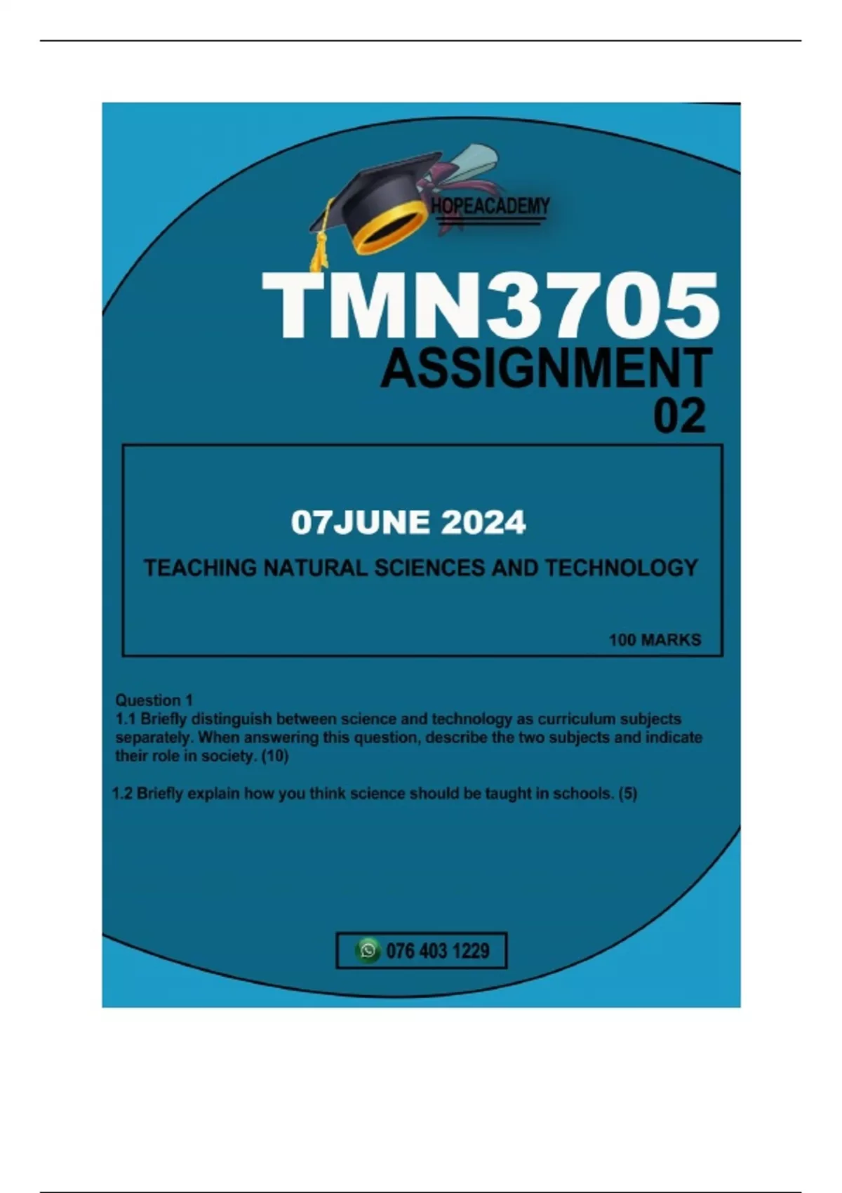 TMN3705 ASSIGNMENT 02 DUE 07 JUNE 2024 Question 1 1.1 Briefly distinguish between science and technology as curriculum subjects separately. When answering this question, describe the two subjects and indicate their role in society. (10)