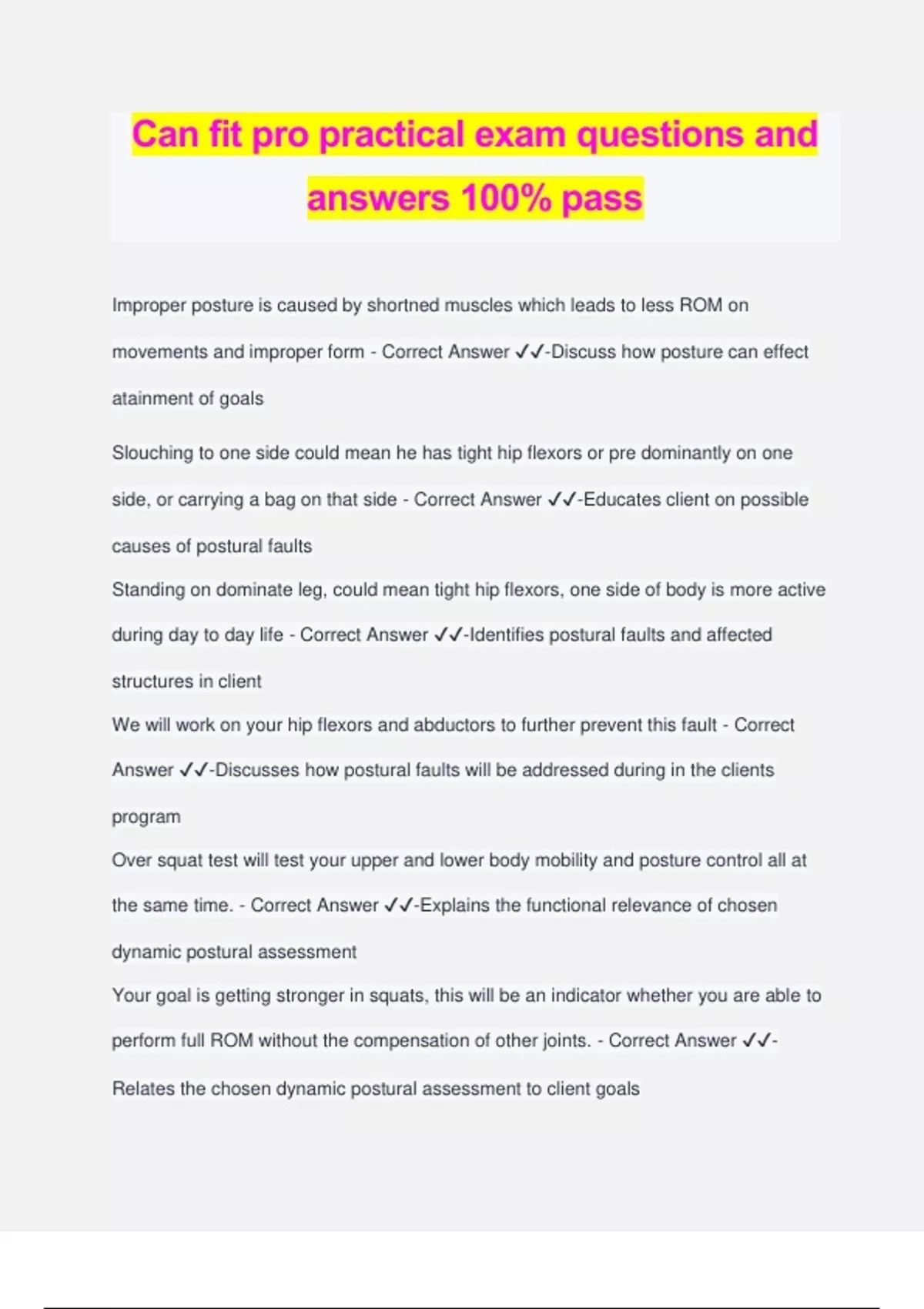 Can fit pro practical exam questions and answers 100% pass Improper posture is caused by shortned muscles which leads to less ROM on movements and improper form - Correct Answer ️️ -Discuss how posture can effect atainment of goals Slouching to one side could mean he has tight hip flexors or pre dominantly on one side, or carrying a bag on that side - Correct Answer ️️ -Educates client on possible causes of postural faults Standing on dominate leg, could mean tight hip flexors, one side of body is more active during day to day life - Correct Answer ️️ -Identifies postural faults and affected structures in client We will work on your hip flexors and abductors to further prevent this fault - Correct Answer ️️ -Discusses how postural faults will be addressed during in the clients program Over squat test will test your upper and lower body mobility and posture control all at the same time. - Correct Answer ️️ -Explains the functional relevance of chosen dynamic postural assessment Your goal is getting stronger in squats, this will be an indicator whether you are able to perform full ROM without the compensation of other joints. - Correct Answer ️️ - Relates the chosen dynamic postural assessment to client goals - Feet is shoulder width apart - grasp stick arms width apart - raise stick over head until i see a slight arch - now squat down while holding the stick overhead - Correct Answer ️️ -Provides clear and thorough instructions about set up and procedure to client With an elevation on your heel it will be easier to perform because of less dorsiflexion. - Correct Answer ️️ -Correctly assesses relative success for each stage of assessment Unable to keep the stick overhead, possibly because of tight SITS or T spine - Correct Answer ️️ -Identifies movement errors present - Score = 0 - we will work on mobility exercises for your SITS and T spine - Correct Answer ️️ - Discusses results and how program will help client improve reassessment resilts warm up prepare the body for exercises by gradually increasing the heart rate this will loosen the joints and increase blood flow to the muscles. prevents injuries. - Correct Answer ️️ -Discusses the importance of completing a warm-up prior to exercise Cardiovascular is important because it helps to boost the supply of oxygen in the body thus boosting strength. - Correct Answer ️️ -Discusses the importance of completing cardiorespiratory training to achieve their goals - turn on treadmill - quick star button - hands on rail for HR - Correct Answer ️️ -Demonstrates and explains correct set up and use of Equipment warm up is 2.0 km gradually increase .2 km of speed every minute while slowly increasing HR RPE will be used to determine how difficult it is - Correct Answer ️️ - Discusses correct intensity and monitoring using RPE and HR % Target heart rate is 115bpm - 144bpm - Correct Answer ️️ -Adjusts intensity as required to achieve desires heart rate - 45 sec mark before each minute - Correct Answer ️️ -Continually monitors client HR improve bone, joint function, bone density, muscle, tendon and ligament strength, - Correct Answer ️️ -Discuss the importance of resistance training Better flexibility may improve your performance in physical activities or decrease your risk of injuries by helping your joints with ROM - Correct Answer ️️ -Explains the importance of completing flexibility training Breathe in on the eccentric phase exhale on the concentric phase, a good tempo is 3.1.1 - Correct Answer ️️ -Discusses correct breathing and tempo for all exercises and stretches Works quads, hams and glutes primarily - Correct Answer ️️ -Highlights the muscles trained to the client (SQUAT) triggers the release of testosterone and human growth hormone in your body, which are vital for muscle growth and will also help to improve muscle mass when you train other areas of your body aside from your leg - Correct Answer ️️ -Explains the purpose and benefit of the exercise to the client based on assessment results and goals