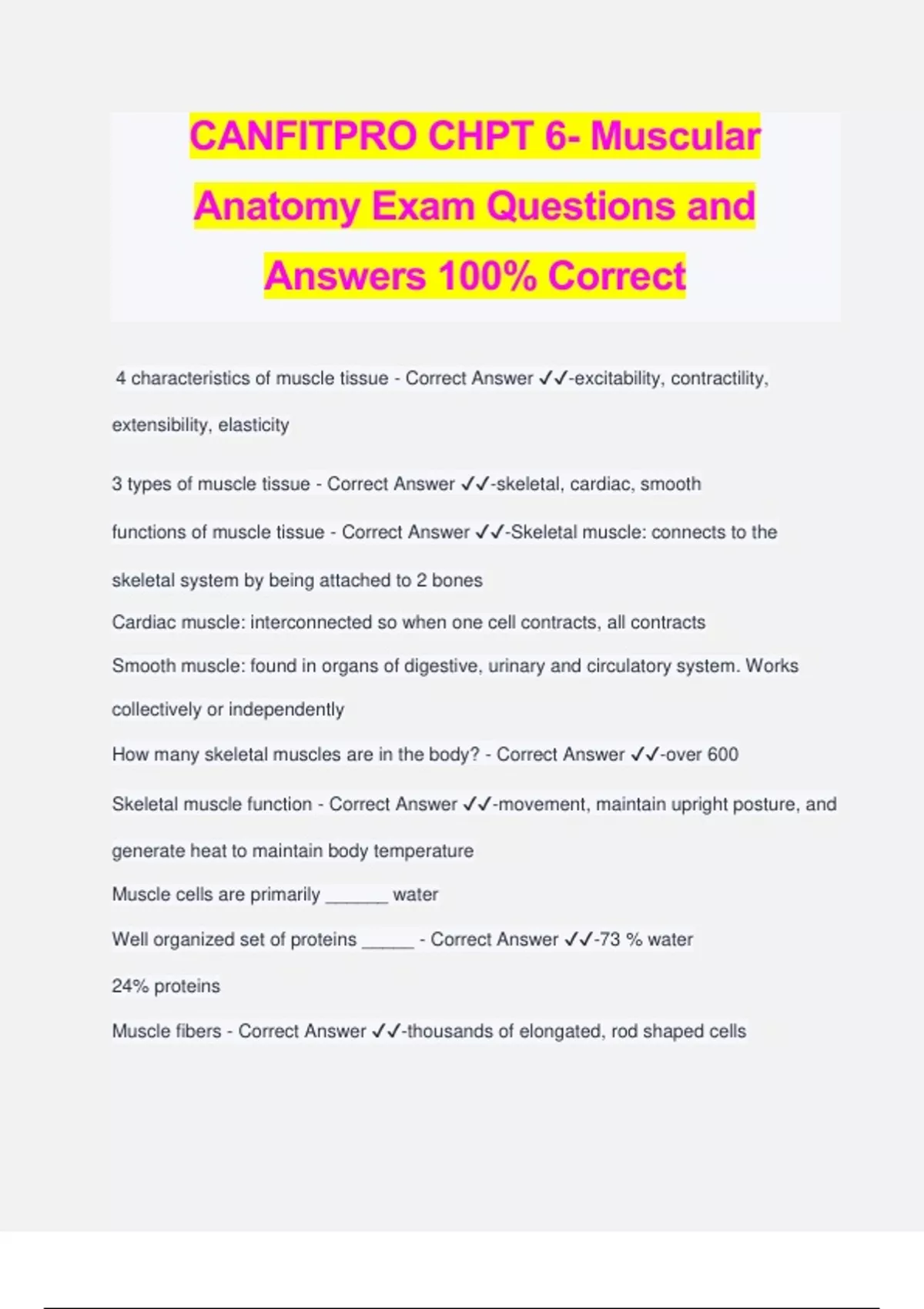 CANFITPRO CHPT 6- Muscular Anatomy Exam Questions and Answers 100% Correct 4 characteristics of muscle tissue - Correct Answer ️️ -excitability, contractility, extensibility, elasticity 3 types of muscle tissue - Correct Answer ️️ -skeletal, cardiac, smooth functions of muscle tissue - Correct Answer ️️ -Skeletal muscle: connects to the skeletal system by being attached to 2 bones Cardiac muscle: interconnected so when one cell contracts, all contracts Smooth muscle: found in organs of digestive, urinary and circulatory system. Works collectively or independently How many skeletal muscles are in the body? - Correct Answer ️️ -over 600 Skeletal muscle function - Correct Answer ️️ -movement, maintain upright posture, and generate heat to maintain body temperature Muscle cells are primarily ______ water Well organized set of proteins _____ - Correct Answer ️️ -73 % water 24% proteins Muscle fibers - Correct Answer ️️ -thousands of elongated, rod shaped cells Fascicle - Correct Answer ️️ -held together by connective tissue layer called perimysium Each muscle fiber is surrounded by a thin elastic membrane called ______ that encloses the contents of fiber - Correct Answer ️️ -sacrolemma 2 types of proteins in sacromere - Correct Answer ️️ -thin filament: actin Thick filament: myosin Types of muscle contractions - Correct Answer ️️ -concentric: shortens eccentric: lengthens isometric: no change in muscle length Skeletal muscle contractions is controlled by ________ - Correct Answer ️️ -Nervous System CNS (central nervous system) - Correct Answer ️️ -consists of the brain and spinal cord It's the control centre of nervous system as it receives information from PNS and develops appropriate response PNS (peripheral nervous system) - Correct Answer ️️ -made up of nerves that connect the extremities to the CNS. Continuously delivers info about all body part to the brain to process sensory neurons (afferent) - Correct Answer ️️ -Carry information and sensation from the body and environment to the CNS motor neurons (efferent) - Correct Answer ️️ -carry information from the CNS back to the muscles to create a response or movement Proprioceptors - Correct Answer ️️ -- specialized sensory receptors found in joints, muscles and tendons. - Sensitive to pressure and tension - responsible for sending messages to CNS to maintain muscle tone and perform coordinated movements Muscle spindles - Correct Answer ️️ -type of proprioceptors that consists of several modified muscle fibers GTO (golgi tendon organ) - Correct Answer ️️ -only activated when muscle contracts slow twitch muscle fibers - Correct Answer ️️ -- perform slow and controlled muscle contractions -contracts slow, resistant to fatigue, work aerobically - better for long endurance activity (marathon) fast twitch muscle fibers - Correct Answer ️️ -- Quick, high-intensity contractions - contract faster, fatigue faster, work anaerobically - e.g. sprinters force that a muscle can generate - Correct Answer ️️ -muscle size A muscle has potential to generate its greatest force when it is at its r