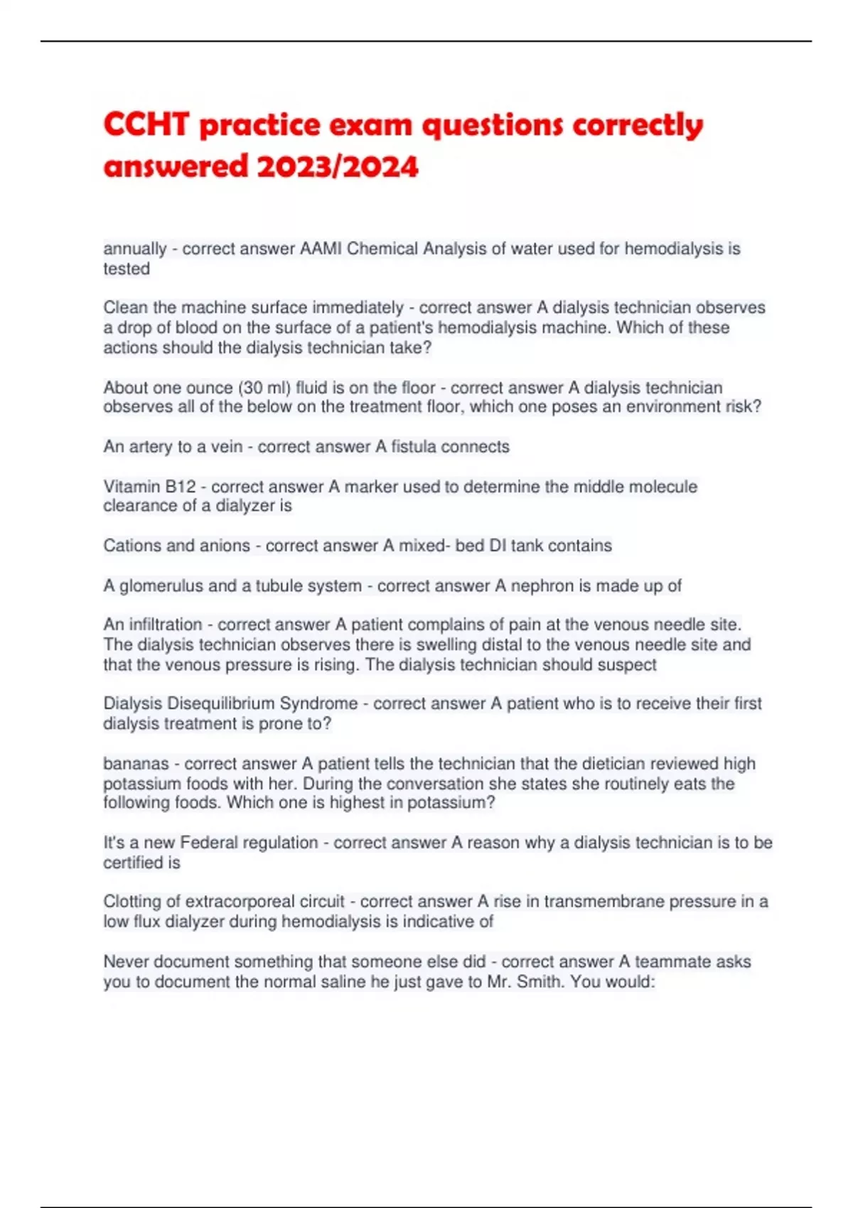 CCHT practice exam questions correctly answered 2023/2024
