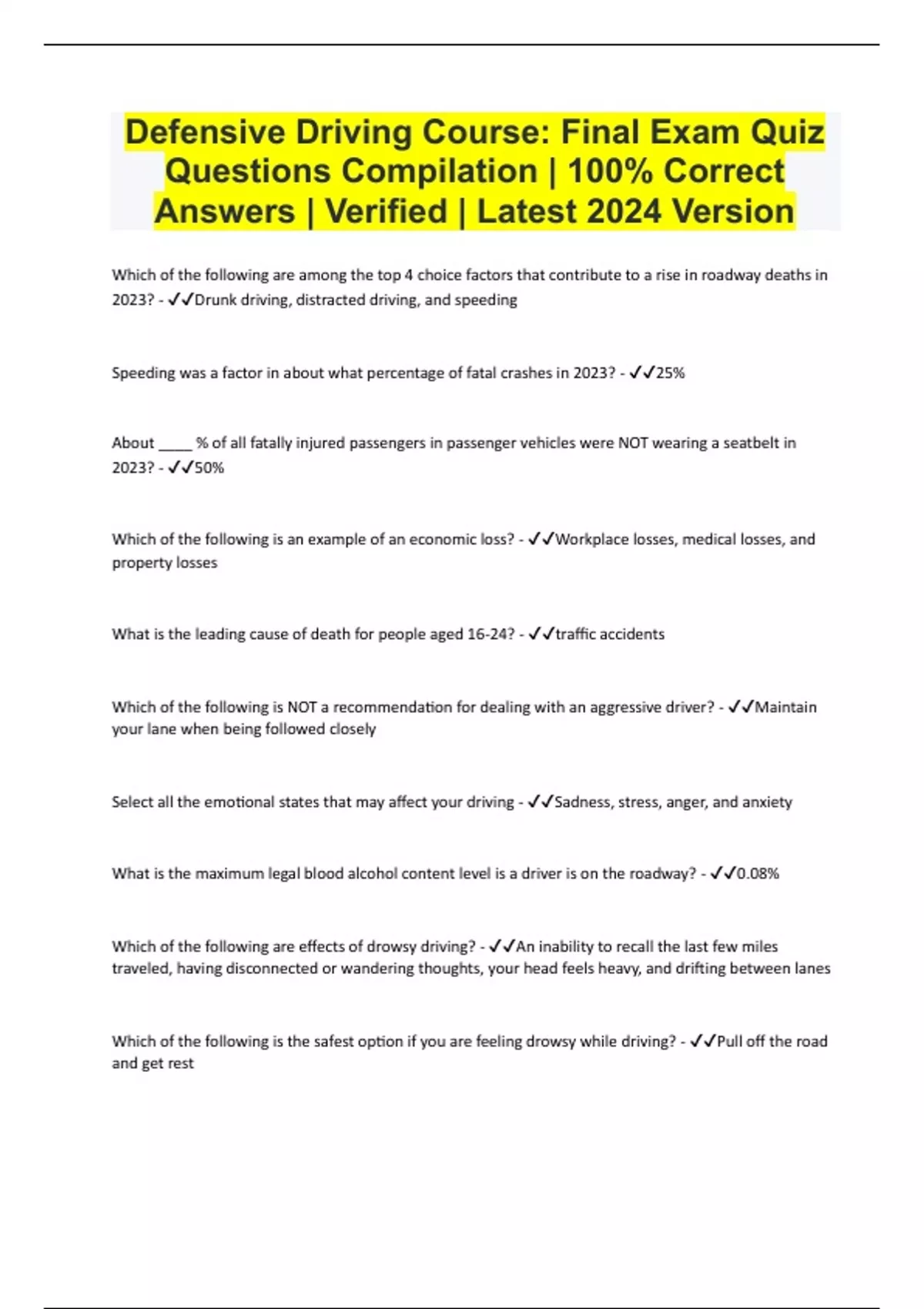 Defensive Driving Course: Final Exam Quiz Questions Compilation | 100% Correct Answers | Verified | Latest 2024 Version