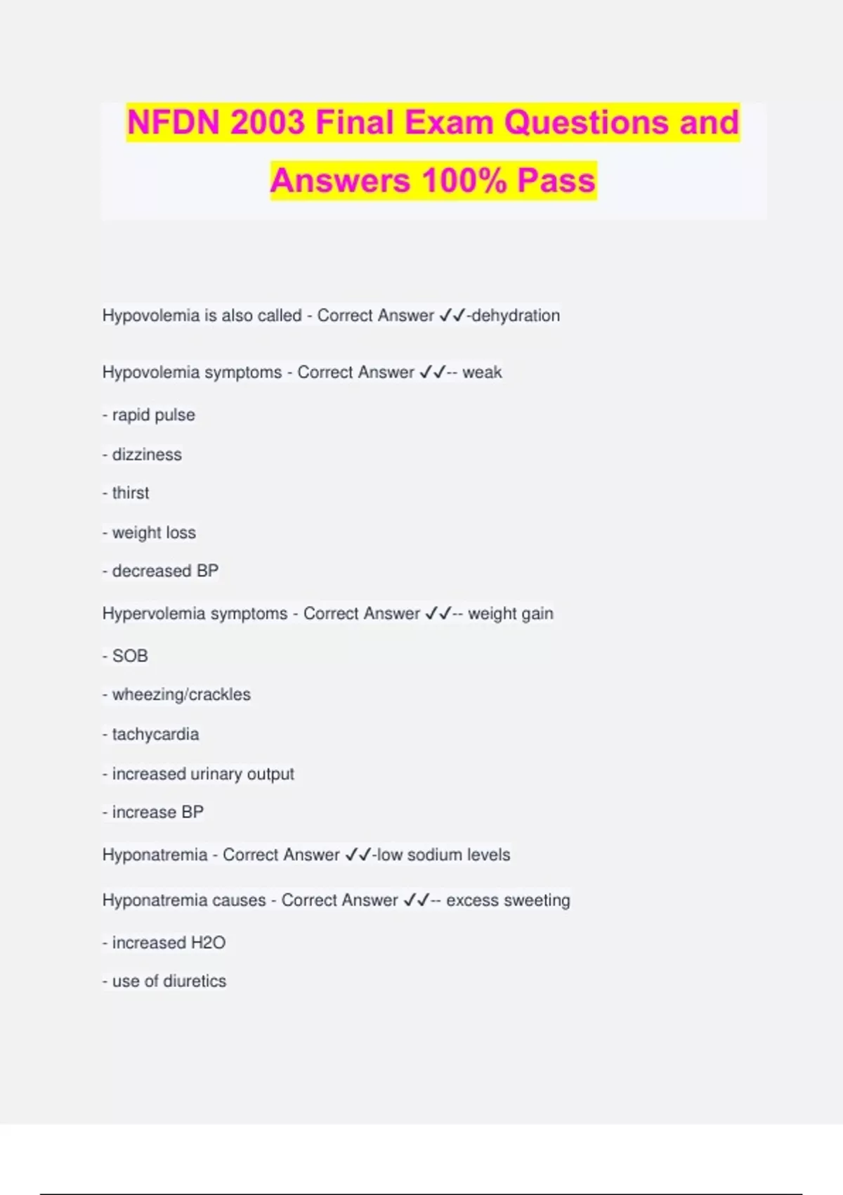 NFDN 2003 Final Exam Questions and Answers 100% Pass Hypovolemia is also called - Correct Answer ️️ -dehydration Hypovolemia symptoms - Correct Answer ️️ -- weak - rapid pulse - dizziness - thirst - weight loss - decreased BP Hypervolemia symptoms - Correct Answer ️️ -- weight gain - SOB - wheezing/crackles - tachycardia - increased urinary output - increase BP Hyponatremia - Correct Answer ️️ -low sodium levels Hyponatremia causes - Correct Answer ️️ -- excess sweeting - increased H2O - use of diuretics Hypernatremia - Correct Answer ️️ -excess sodium leves Hypernatremia causes - Correct Answer ️️ -- diarrhea - heat stroke - hyperventilation pH normal levels - Correct Answer ️️ -7.35-7.45 PaCO2 normal levels - Correct Answer ️️ -35-45mmHg HCO3 (Bicarb) normal levels - Correct Answer ️️ -22-26mmol/L Respiratory Acidosis - Correct Answer ️️ -- results from retention of CO2 & decrease of pH Respiratory Acidosis Symptoms - Correct Answer ️️ -- increased pulse - increased resps - increased BP - mental cloudiness Respiratory Acidosis Treatment - Correct Answer ️️ -- bronchodilators - anticoagulants - place pt in semi fowlers Respiratory Alkalosis - Correct Answer ️️ -- rapid or excess elimination of CO2 & increase pH - cause: hyperventilation Respiratory Alkalosis symptoms - Correct Answer ️️ -- dizzy - light headed - paraesthesia of extremities Respiratory Alkalosis Treatment - Correct Answer ️️ -- slow breathing - breath into paper bag Metabolic Acidosis - Correct Answer ️️ -- decrease bicarb (HCO3) - pH = < 7.35 Metabolic Acidosis symptoms - Correct Answer ️️ -- headache - confusion - drowsiness - increase resp rate - decrease BP - cold/clammy skin Metabolic Acidosis Treatment - Correct Answer ️️ -- give bicarb - may need dialysis Metabolic Alkalosis - Correct Answer ️️ -- increase bicarb - ph= > 7.45 - excessive vomiting or diarrhea Metabolic Alkalosis symptoms - Correct Answer ️️ -- paraesthesia of fingers and toes - dizzy - depressed respirations Metabolic Alkalosis Treatment - Correct Answer ️️ -- fluid hydrating with NaCl - monitor input/output CAREFULLY Isotonic solution - Correct Answer ️️ -- osmolality close to blood pla