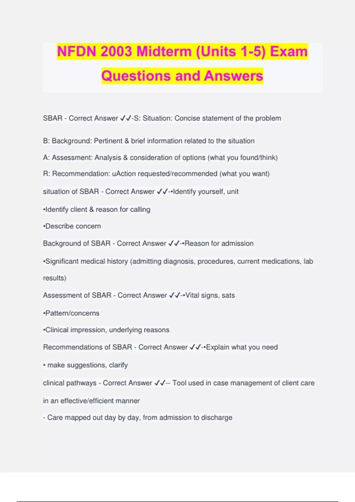 NFDN 2003 Midterm (Units 1-5) Exam Questions and Answers SBAR - Correct Answer ️️ -S: Situation: Concise statement of the problem B: Background: Pertinent & brief information related to the situation A: Assessment: Analysis & consideration of options (what you found/think) R: Recommendation: uAction requested/recommended (what you want) situation of SBAR - Correct Answer ️️ -•Identify yourself, unit •Identify client & reason for calling •Describe concern Background of SBAR - Correct Answer ️️ -•Reason for admission •Significant medical history (admitting diagnosis, procedures, current medications, lab results) Assessment of SBAR - Correct Answer ️️ -•Vital signs, sats •Pattern/concerns •Clinical impression, underlying reasons Recommendations of SBAR - Correct Answer ️️ -•Explain what you need • make suggestions, clarify clinical pathways - Correct Answer ️️ -- Tool used in case management of client care in an effective/efficient manner - Care mapped out day by day, from admission to discharge - Identifies key events that must occur within specific time frames common features of clinical pathways - Correct Answer ️️ -- Serve as an interdisciplinary care plan - Tool for tracking client progress toward achieving positive outcomes - Specific time frame - Developed for certain diagnosis(OHS, fractured hip), high risk clients, common health problems (diabetes, chronic pain), Elderly. nurse role in clinical pathway - Correct Answer ️️ -- Participating in the development - Responsible for initiating the pathway on appropriate clients - Ensure that events occur as planned - Enhancing & monitoring outcomes - Documentation purpose of documentation - Correct Answer ️️ -important deliver safe & efficient care (comprehensive care given for Dr. to use when creating orders). Make sure we are doing what the physician wants us to do. social determinants of health - Correct Answer ️️ -The conditions in which people are born, grow, live, work, and age, shaped by the distribution of money, power, and resources at global, national, and local levels. For example, not everyone has insurance; don't assume Factors that impair wound healing - Correct Answer ️️ -Age, malnutrition, obesity, impaired oxygenation, smoking, drugs, diabetes mellitus, radiation, wound stress purpose of dressings - Correct Answer ️️ -Protect a wound from microorganism contamination Aid in hemostasis Promote healing by absorbing drainage and debriding a wound Support or splint the wound site Protect patients from seeing the wound (if perceived as unpleasant) Promote thermal insulation of the wound surface Kerlix Dressing - Correct Answer ️️ -broad elastic gauze dressing often a