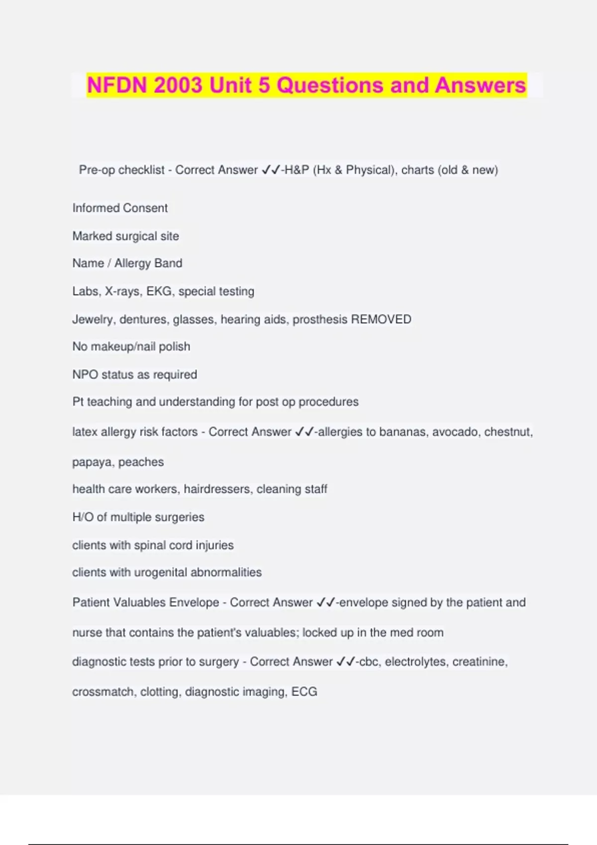 NFDN 2003 Unit 5 Questions and Answers Pre-op checklist - Correct Answer ️️ -H&P (Hx & Physical), charts (old & new) Informed Consent Marked surgical site Name / Allergy Band Labs, X-rays, EKG, special testing Jewelry, dentures, glasses, hearing aids, prosthesis REMOVED No makeup/nail polish NPO status as required Pt teaching and understanding for post op procedures latex allergy risk factors - Correct Answer ️️ -allergies to bananas, avocado, chestnut, papaya, peaches health care workers, hairdressers, cleaning staff H/O of multiple surgeries clients with spinal cord injuries clients with urogenital abnormalities Patient Valuables Envelope - Correct Answer ️️ -envelope signed by the patient and nurse that contains the patient's valuables; locked up in the med room diagnostic tests prior to surgery - Correct Answer ️️ -cbc, electrolytes, creatinine, crossmatch, clotting, diagnostic imaging, ECG informed consent - Correct Answer ️️ -obtained by the surgeon; nurse may ensure the consent form is signed BUT if there are questions, contact the surgeon general anesthesia - Correct Answer ️️ -involves the total loss of body sensation and consciousness induced by anesthetic agents administered primarily by inhalation or intravenous injection spinal anesthesia - Correct Answer ️️ -regional anesthesia produced by injecting medication into the subarachnoid space (below the spinal cord) epidural anesthesia - Correct Answer ️️ -regional anesthesia produced by injecting medication into the epidural space of the lumbar or sacral region of the spine nerve block - Correct Answer ️️ -injection of regional anesthetic to stop the passage of sensory or pain impulses along a nerve path local anesthesia - Correct Answer ️️ -causes the loss of sensation in a limited area by injecting an anesthetic solution near that area conscious sedation - Correct Answer ️️ -a decreased level of consciousness in which the patient is not completely asleep Surgical Risk Factors - Correct Answer ️️ -~Age ~Obesity ~Nutrition alterations ~Co-morbidities ~Smoking ~Anticoagulants postop assessment - Correct Answer ️️ -Airway and respiration (patency, rate, rhythm, symmetry, breath sounds, color of mucous membranes), Circulation (heart rate, rhythm, BP, capillary refill, nail beds, peripheral pulses, temp Control), f&e balance, IV I&O compare baseline lab values, Neurological functions (LOC, gag and pupil reflexes), skin integrity and condition of wound, genitourinary(urinary function returns in 6-8 hours),Gastrointestinal (anesthesia slow motility), comfort (use pain scale), surgical site Hypothermia - Correct Answer ️️ -abnormally low body temperature; comm