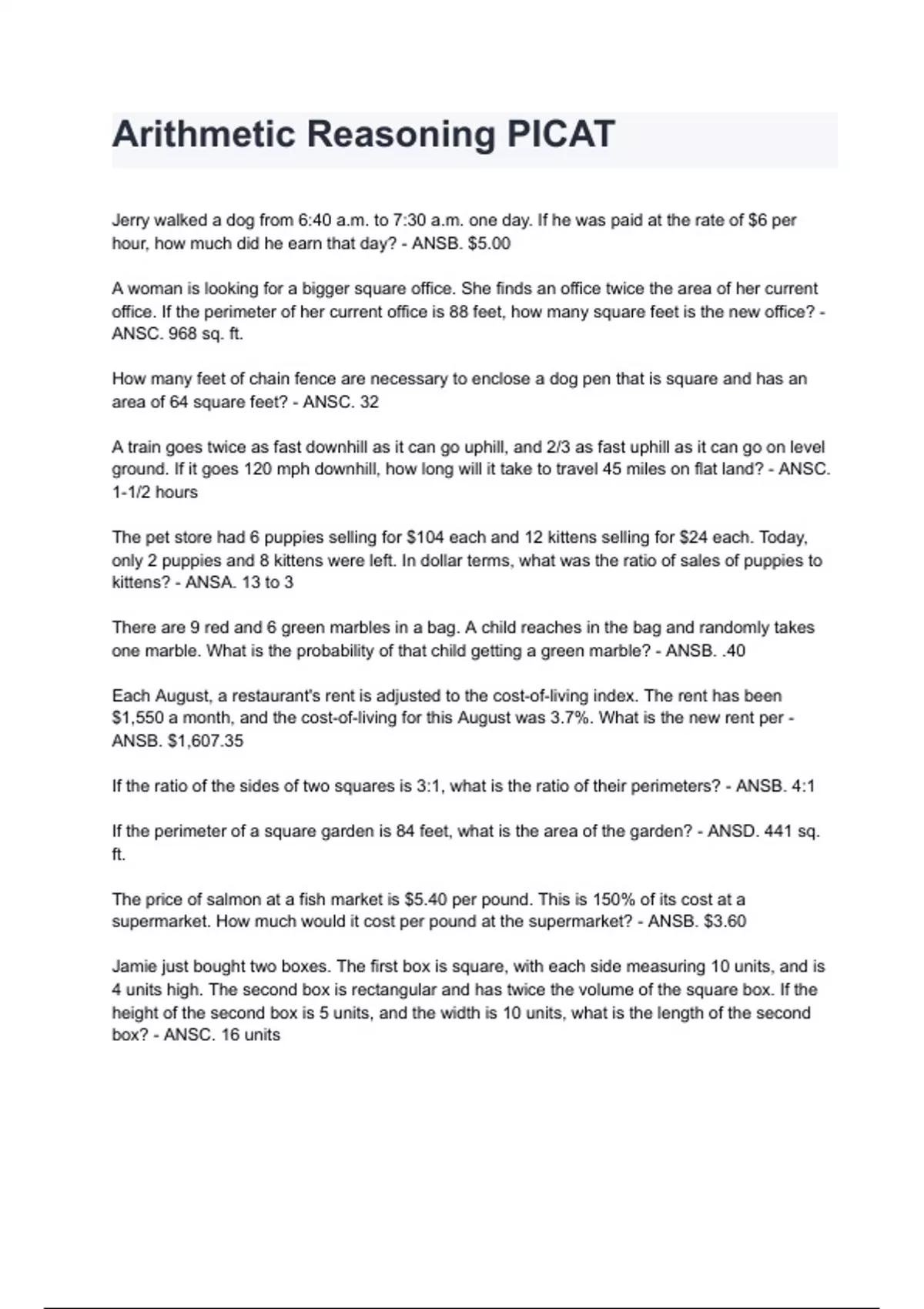Arithmetic Reasoning PICAT questions and answers guaranteed pass 2024/2025