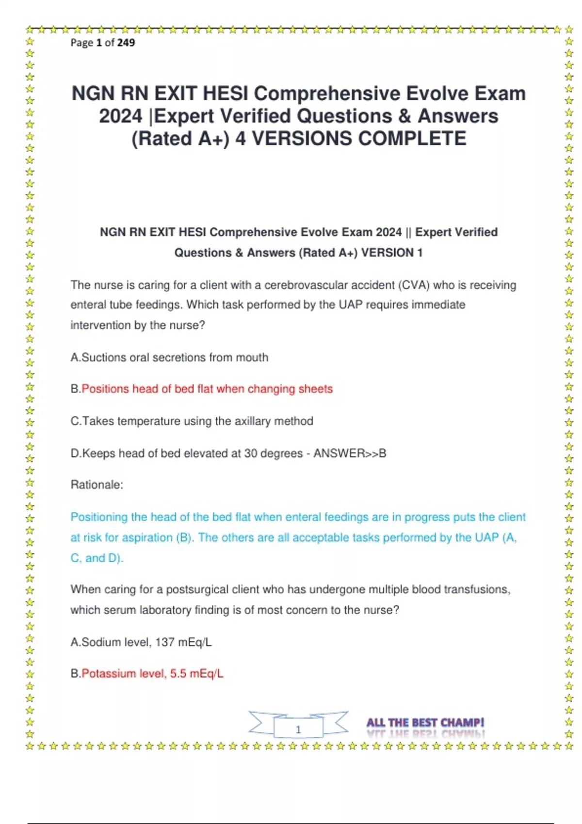 NGN RN EXIT HESI Comprehensive Evolve Exam 2024 Expert Verified Questions & Answers (Rated A+) 4 VERSIONS COMPLETE