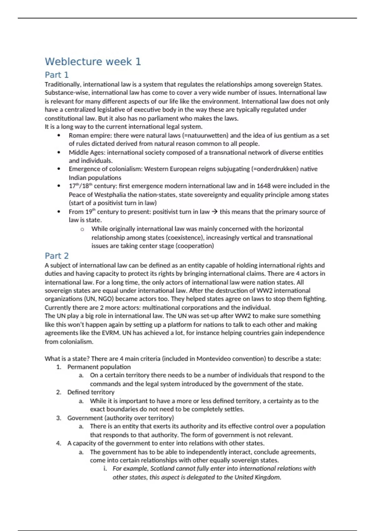 These are all notes from the Introduction to international and eu law web lectures. Everything can be found in it, you basically no longer have to watch the web lectures yourself, which saves a lot of time and these web lectures will largely be part of your exam. This course is taught both when studying criminology and law.