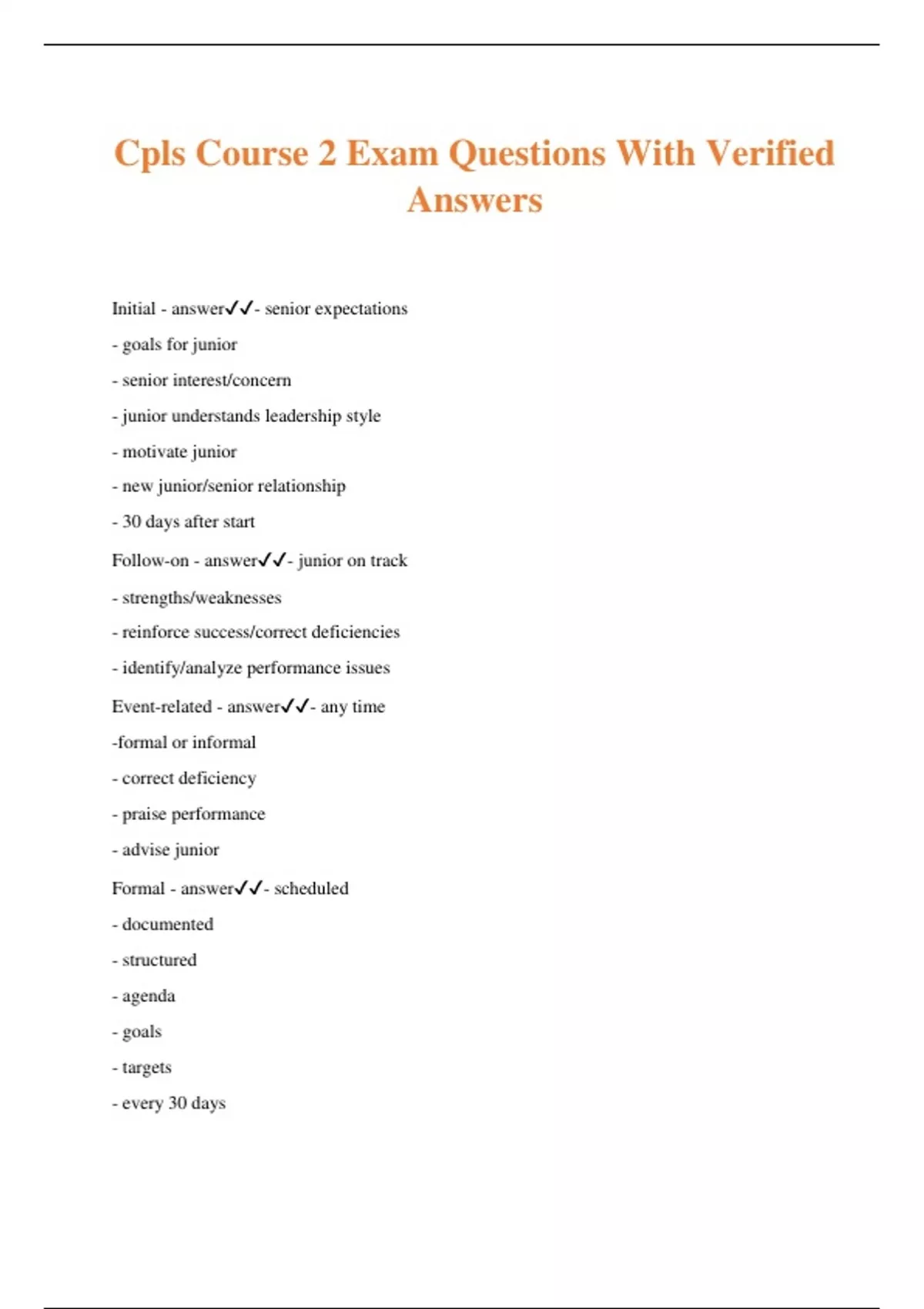 Cpls Course 2 Exam Questions With Verified Answers Initial - answer- senior expectations - goals for junior - senior interest/concern - junior understands leadership style - motivate junior - new junior/senior relationship - 30 days after start Follow-on - answer- junior on track - strengths/weaknesses - reinforce success/correct deficiencies - identify/analyze performance issues Event-related - answer- any time -formal or informal - correct deficiency - praise performance - advise junior Formal - answer- scheduled - documented - structured - agenda - goals - targets - every 30 days - 10-15 minutes Informal - answer- unscheduled - undocumented - less structure Counseling types - answer- directive - Nondirective - collaborative Directive - answer- analyze situation - develop plan/solution - tell your marines Nondirective - answer- ask questions - allow feedback - help your marines Collaborative - answer- both work together Preparing counseling - answer- review/evaluate performance - define objectives - develop agenda - schedule time/location Conducting counseling (opening) - answer- relaxed tone - review agenda Main body - answer- refer to agenda - encourage participation - buy in on targets Closing - answer- both understand what is expected - summarize Document sessions - answer- date - name of marine being consueled