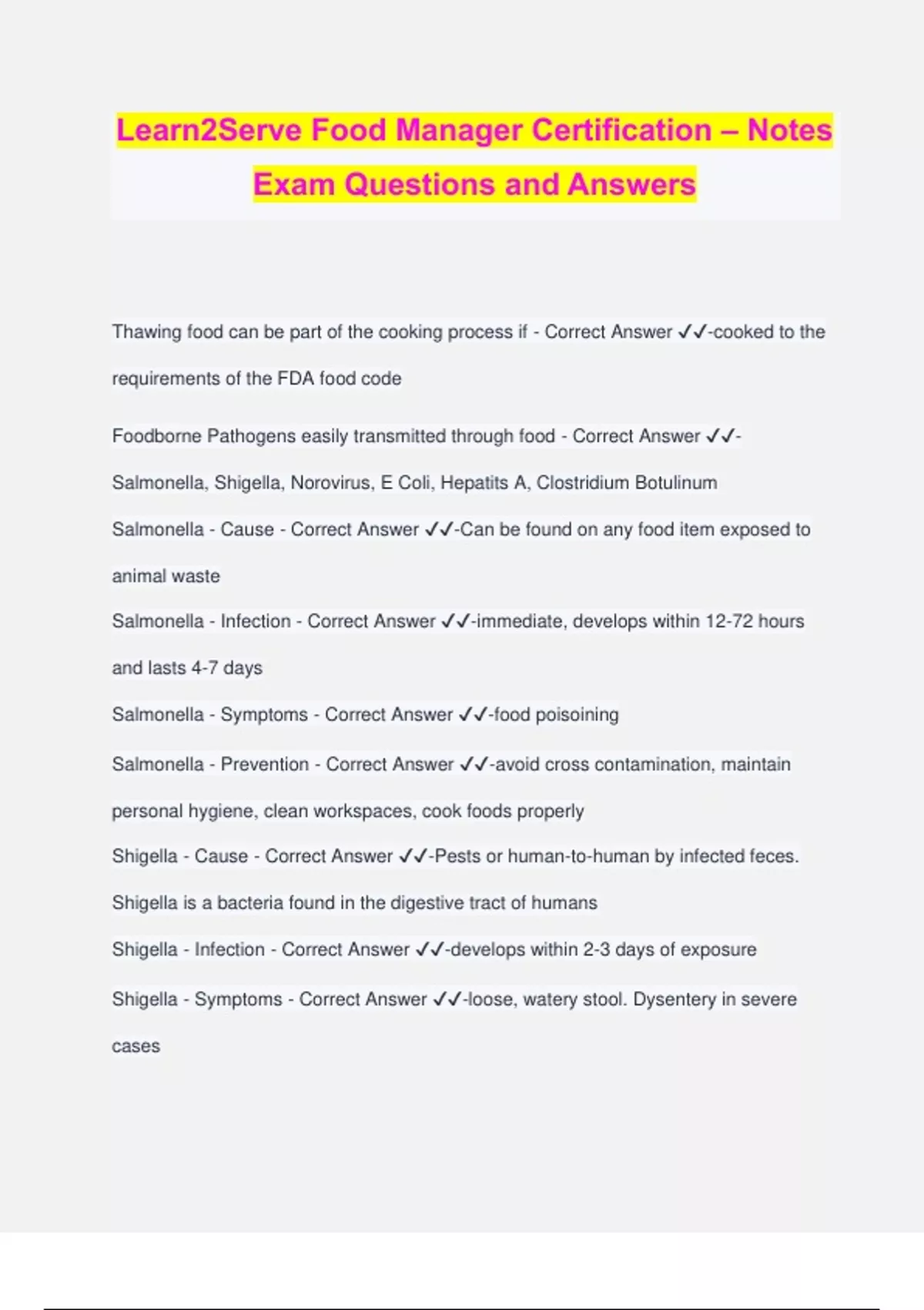Learn2Serve Food Manager Certification – Notes Exam Questions and Answers Thawing food can be part of the cooking process if - Correct Answer ️️ -cooked to the requirements of the FDA food code Foodborne Pathogens easily transmitted through food - Correct Answer ️️ - Salmonella, Shigella, Norovirus, E Coli, Hepatits A, Clostridium Botulinum Salmonella - Cause - Correct Answer ️️ -Can be found on any food item exposed to animal waste Salmonella - Infection - Correct Answer ️️ -immediate, develops within 12-72 hours and lasts 4-7 days Salmonella - Symptoms - Correct Answer ️️ -food poisoining Salmonella - Prevention - Correct Answer ️️ -avoid cross contamination, maintain personal hygiene, clean workspaces, cook foods properly Shigella - Cause - Correct Answer ️️ -Pests or human-to-human by infected feces. Shigella is a bacteria found in the digestive tract of humans Shigella - Infection - Correct Answer ️️ -develops within 2-3 days of exposure Shigella - Symptoms - Correct Answer ️️ -loose, watery stool. Dysentery in severe cases Shigella - Prevention - Correct Answer ️️ -may spread to others through contaminated stool up to 4 weeks after symptoms have passed Norovirus - Cause - Correct Answer ️️ -food items or water sources contaminated with infected feces or fluids Norovirus - Infection - Correct Answer ️️ -sudden onset, 1-2 days, extremely contagious Norovirus - Symptoms - Correct Answer ️️ -gastroenteritis or "stomach flu" Norovirus - Prevention - Correct Answer ️️ -can be infectious three days - two weeks after recovery E.Coli - Cause - Correct Answer ️️ -Poor processing and handling of food that has been contaminated (i.e. manure-based fertilizers). Bacteria found in digestive tract of humans, most strains harmless. E. Coli - Infection - Correct Answer ️️ -develops within 3-4 days E. Coli - Symptoms - Correct Answer ️️ -bloody diarrhea, severe cases cause blood problems and kidney failure E. Coli - Prevention - Correct Answer ️️ -proper handling and cooking to safe temperatures, proper hand washing after restroom, proper fruit and veg washing Hepatitis A - Cause - Correct Answer ️️ -raw or undercooked shellfish harvested from polluted waters, other infected individuals, cold cuts, fresh squeeze juices, raw fruits and veg, water contaminated with sewage Hepatitis A - Infection - Correct Answer ️️ -sudden ons