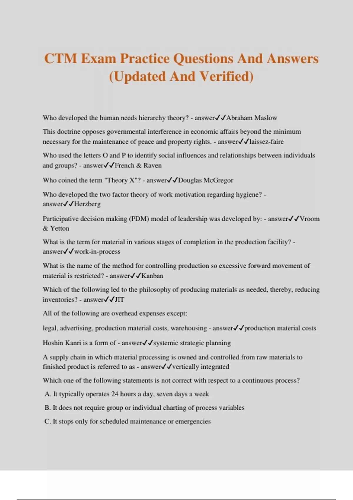 CTM Exam Practice Questions And Answers (Updated And Verified) Who developed the human needs hierarchy theory? - answerAbraham Maslow This doctrine opposes governmental interference in economic affairs beyond the minimum necessary for the maintenance of peace and property rights. - answerlaissez-faire Who used the letters O and P to identify social influences and relationships between individuals and groups? - answerFrench & Raven Who coined the term "Theory X"? - answerDouglas McGregor Who developed the two factor theory of work motivation regarding hygiene? - answerHerzberg Participative decision making (PDM) model of leadership was developed by: - answerVroom & Yetton What is the term for material in various stages of completion in the production facility? - answerwork-in-process What is the name of the method for controlling production so excessive forward movement of material is restricted? - answerKanban Which of the following led to the philosophy of producing materials as needed, thereby, reducing inventories? - answerJIT All of the following are overhead expenses except: legal, advertising, production material costs, warehousing - answerproduction material costs Hoshin Kanri is a form of - answersystemic strategic planning A supply chain in which material processing is owned and controlled from raw materials to finished product is referred to as - answervertically integrated Which one of the following statements is not correct with respect to a continuous process? A. It typically operates 24 hours a day, seven days a week B. It does not require group or individual charting of process variables C. It stops only for scheduled maintenance or emergencies