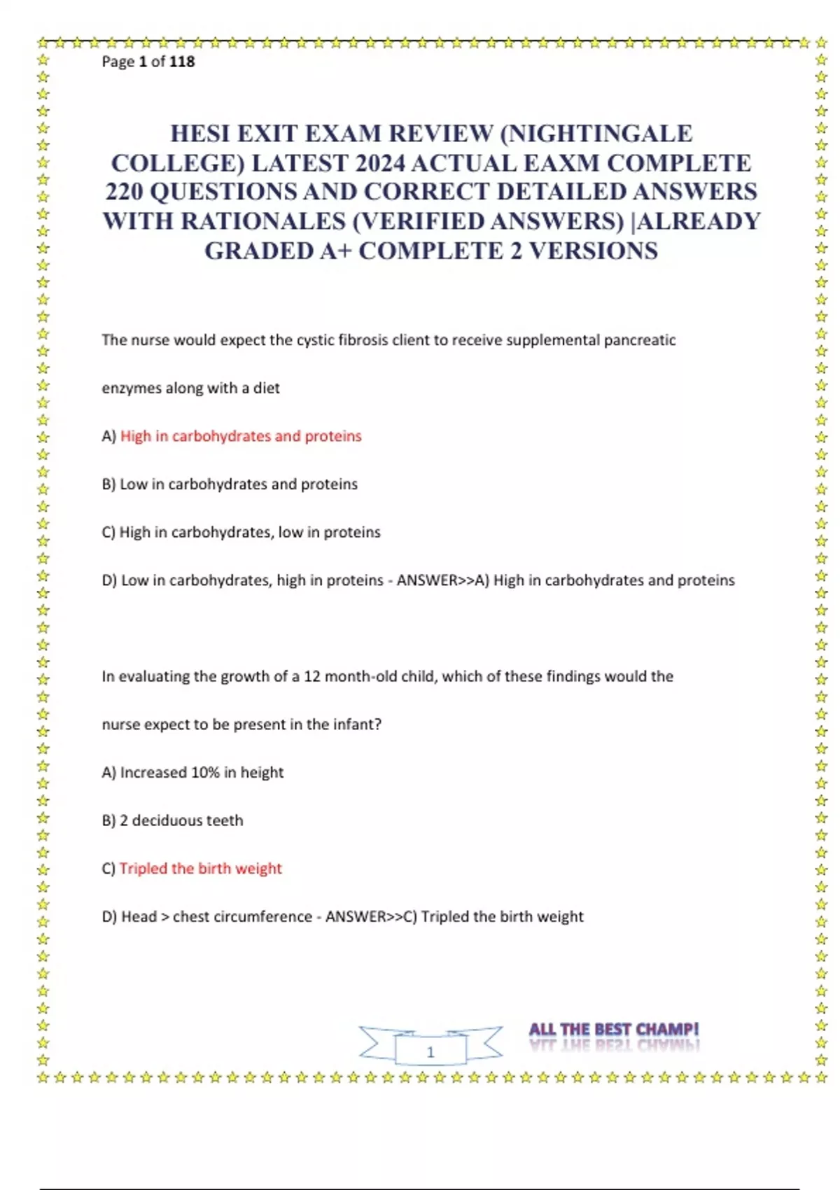 HESI EXIT EXAM REVIEW (NIGHTINGALE COLLEGE) LATEST 2024 ACTUAL EAXM COMPLETE 220 QUESTIONS AND CORRECT DETAILED ANSWERS WITH RATIONALES (VERIFIED ANSWERS) ALREADY GRADED A+ COMPLETE 2 VERSIONS