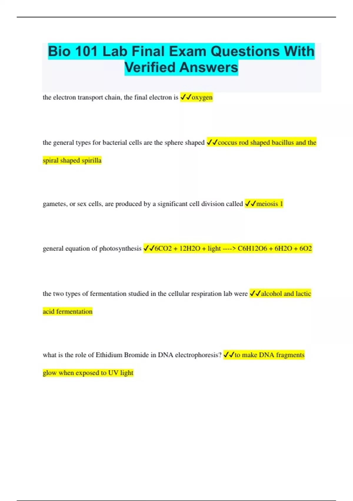 Bio 101 Lab Final Exam Questions With Verified Answers the electron transport chain, the final electron is oxygen the general types for bacterial cells are the sphere shaped coccus rod shaped bacillus and the spiral shaped spirilla gametes, or sex cells, are produced by a significant cell division called meiosis 1 general equation of photosynthesis 6CO2 + 12H2O + light ----> C6H12O6 + 6H2O + 6O2 the two types of fermentation studied in the cellular respiration lab were alcohol and lactic acid fermentation what is the role of Ethidium Bromide in DNA electrophoresis? to make DNA fragments glow when exposed to UV light during the cellular respiration lab, bromothymol blue was use to detect CO2. what did you observe to let you know CO2 was present? when CO2 gas bubbles through a brothymol blue indicator solution the indicator solution turns yellow using the absorbance spectrum, which wavelengths are absorbed the best? what colors of light correspond to those wavelengths? 400-500 violet blue the process of DNA electrophoresis separates DNA fragments based on size and or change a fruit fly that is homozygous dominant for both eye color and wing shape is crossed with a fruit fly that is homozygous recessive for both. if these two flies are the P generation, indicate the phenotypic ratio for for the F2 generation all phenotypes are black eyed with smooth wings a gram positive bacteria will appear dark purple because of a simple layer of peptidoglycan chlorophyll, xanthophyll, and beta-carotene are all examples of carotenoids what is the purpose of using UV light durning DNA electrophoresis? the DNA fragments shine bright when exposed to UV light a single cell undergoes three rounds of mitosis. how many cells exist after these three rounds? if the original cell has 42 chromosomes,
