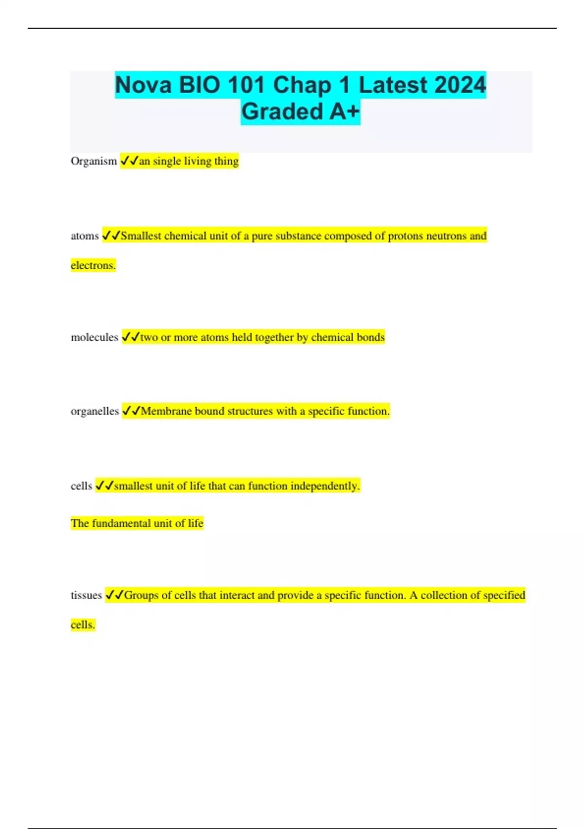 Nova BIO 101 Chap 1 Latest 2024 Graded A+ Organism an single living thing atoms Smallest chemical unit of a pure substance composed of protons neutrons and electrons. molecules two or more atoms held together by chemical bonds organelles Membrane bound structures with a specific function. cells smallest unit of life that can function independently. The fundamental unit of life tissues Groups of cells that interact and provide a specific function. A collection of specified cells. organs Consisting of two or more tissues organized to interact and function as a integrated unit. eg. 1 acacia tree. populations interbreeding members of the same species occupying the same region. e.g. Multiple acacia trees communities group of interacting populations that inhabit the same region. e.g. al populations in the savanna. ecosystems a living community and nonliving components of an area. e.g.. the savanna biosphere area where life can exist emergent properties quality that results from interactions of a system's components. The whole is greater than the sum of it's parts producers (Autotrophs) Organism that uses inorganic sources of energy and carbon. Extracts energy and nutrients from nonliving things.