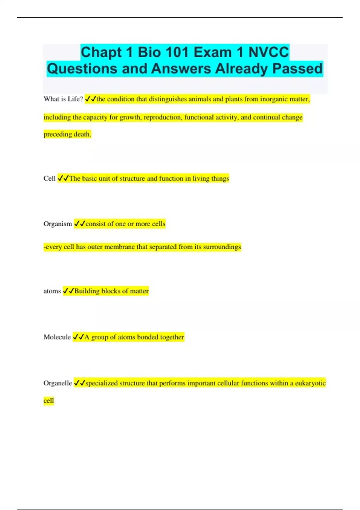 Chapt 1 Bio 101 Exam 1 NVCC Questions and Answers Already Passed What is Life? the condition that distinguishes animals and plants from inorganic matter, including the capacity for growth, reproduction, functional activity, and continual change preceding death. Cell The basic unit of structure and function in living things Organism consist of one or more cells -every cell has outer membrane that separated from its surroundings atoms Building blocks of matter Molecule A group of atoms bonded together Organelle specialized structure that performs important cellular functions within a eukaryotic cell Tissues Groups of cells with a common structure and function. organs Tissues are organized into:, group of tissues that work together to perform closely related functions. organ system group of organs that work together to perform a specific function Population a group of organisms of the same species populating a given area Community assemblage of different populations that live together in a defined area Ecosystem A biological community of interacting organisms and their physical environment. Biosphere part of Earth in which life exists including land, water, and air or atmosphere emergent properties New properties that emerge with each step upward in the hierarchy of life, owing to the arrangement and interactions of parts as complexity increases. Producers Organisms that make their own food Autotroph An organism that makes its own food Nutrients Substances in food that your body needs