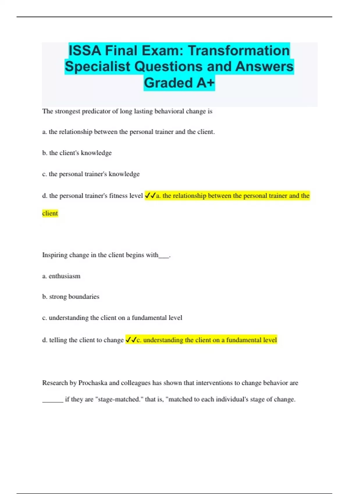 ISSA Final Exam: Transformation Specialist Questions and Answers Graded A+ The strongest predicator of long lasting behavioral change is a. the relationship between the personal trainer and the client. b. the client's knowledge c. the personal trainer's knowledge d. the personal trainer's fitness level a. the relationship between the personal trainer and the client Inspiring change in the client begins with___. a. enthusiasm b. strong boundaries c. understanding the client on a fundamental level d. telling the client to change c. understanding the client on a fundamental level Research by Prochaska and colleagues has shown that interventions to change behavior are ______ if they are "stage-matched." that is, "matched to each individual's stage of change. a. less effective b. more effective c. only effective in the short term d. only effective with specific populations b. more effective Which is not a factor necessary for people to change? a. self-efficacy b. an awareness of the "pros" and "cons" of change c. strategies to maintain change d. someone to hold them accountable to change d. someone to hold them accountable to change People in the pre-contemplation stage a. minimizes the risks of not changing b. be very aware of why they desire change c. have already practiced change strategies d. do not want to talk about change a. minimize the risks of not changing In the contemplation stage people weigh the benefits and risks of change a. without a desire to change b. equally c. but do not want to talk about change d. but do not need self-efficacy b. equally Assessing the stage of change can be helped with a. direct answer questions b. verbal affirmations c. validation