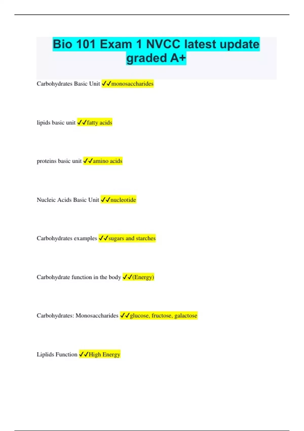 Bio 101 Exam 1 NVCC latest update graded A+ Carbohydrates Basic Unit monosaccharides lipids basic unit fatty acids proteins basic unit amino acids Nucleic Acids Basic Unit nucleotide Carbohydrates examples sugars and starches Carbohydrate function in the body (Energy) Carbohydrates: Monosaccharides glucose, fructose, galactose Liplids Function High Energy Protein examples hemoglobin, enzymes, insulin protein functions Storage, Hormonal, Contractile, Defensive,Transport, Receptor, Structural Which is better Saturated or Unsaturated Butter? Unsaturated Butter- Double bond (easier to break down) Nucleic Acids is a Monomer or Polymomer Monomer Nucleic Acid show Genes (Genome) DNA nitrogen bases Guanine (G), Cytosine (C), Adenine (A), Thymine (T) RNA nitrogen bases Guanine (G), Cytosine (C), Adenine (A), Uracil (U) The strongest bonds are Covalent bonds