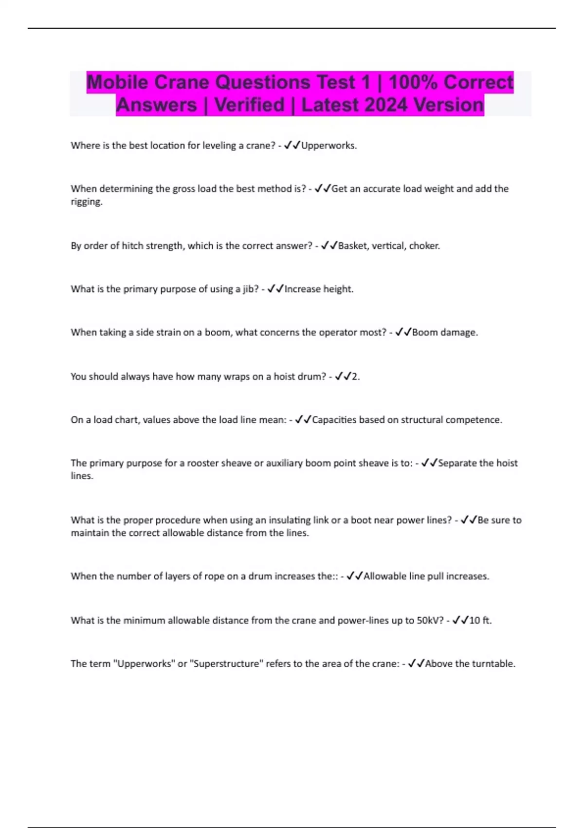 Mobile Crane Questions Test 1 | 100% Correct Answers | Verified | Latest 2024 Version