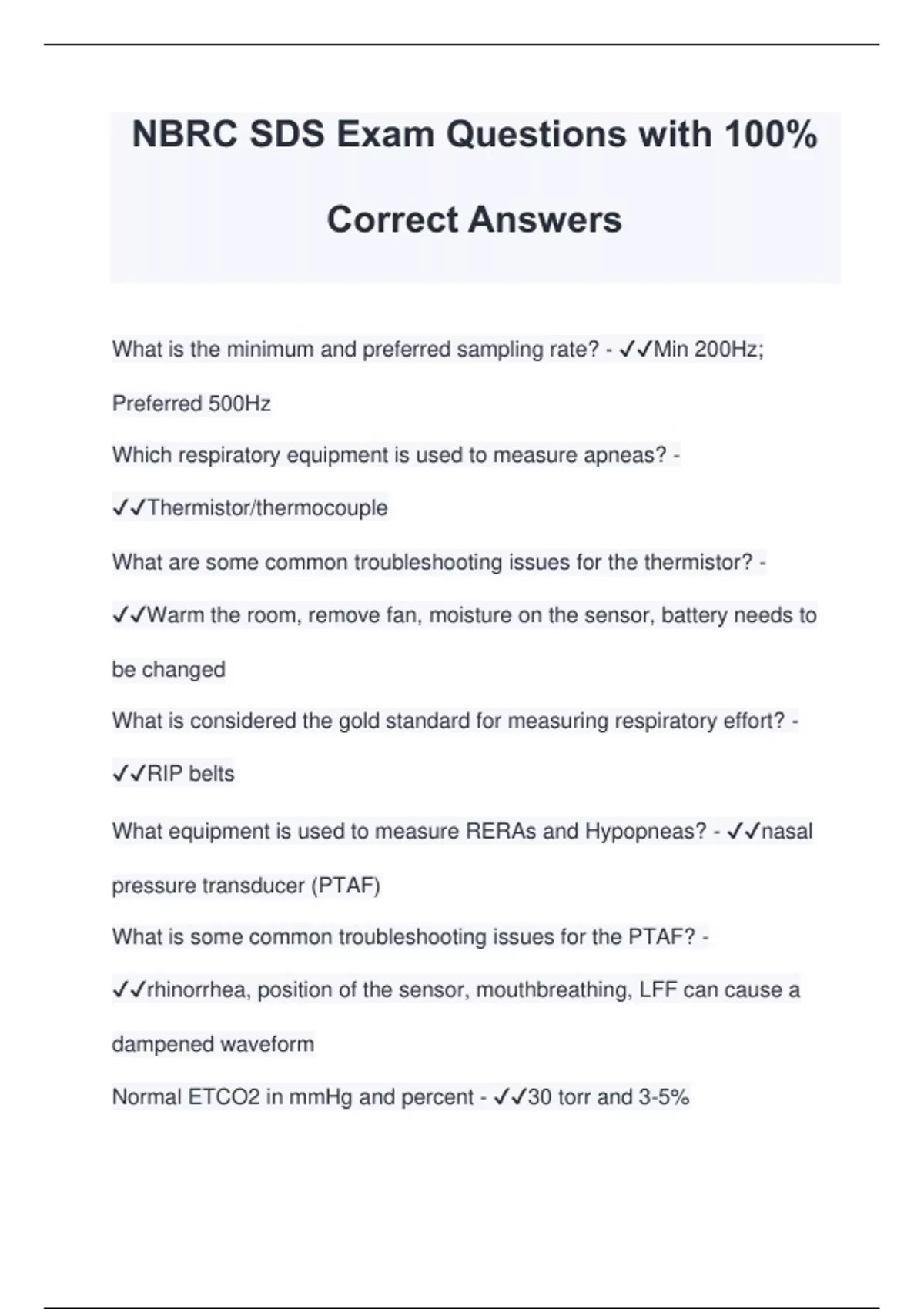 NBRC SDS Exam Questions with 100% Correct Answers What is the minimum and preferred sampling rate? - Min 200Hz; Preferred 500Hz Which respiratory equipment is used to measure apneas? - Thermistor/thermocouple What are some common troubleshooting issues for the thermistor? - Warm the room, remove fan, moisture on the sensor, battery needs to be changed What is considered the gold standard for measuring respiratory effort? - RIP belts What equipment is used to measure RERAs and Hypopneas? - nasal pressure transducer (PTAF) What is some common troubleshooting issues for the PTAF? - rhinorrhea, position of the sensor, mouthbreathing, LFF can cause a dampened waveform Normal ETCO2 in mmHg and percent - 30 torr and 3-5%