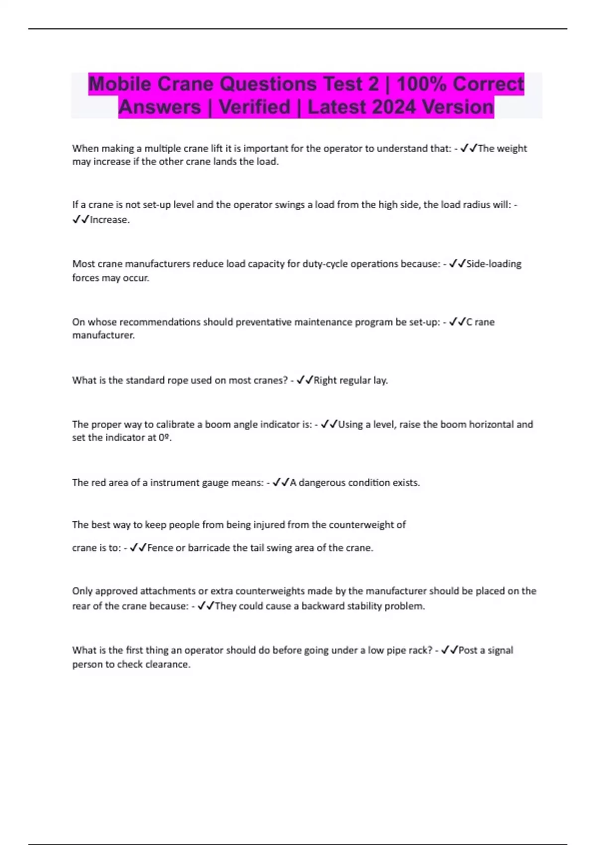 Mobile Crane Questions Test 2 | 100% Correct Answers | Verified | Latest 2024 Version