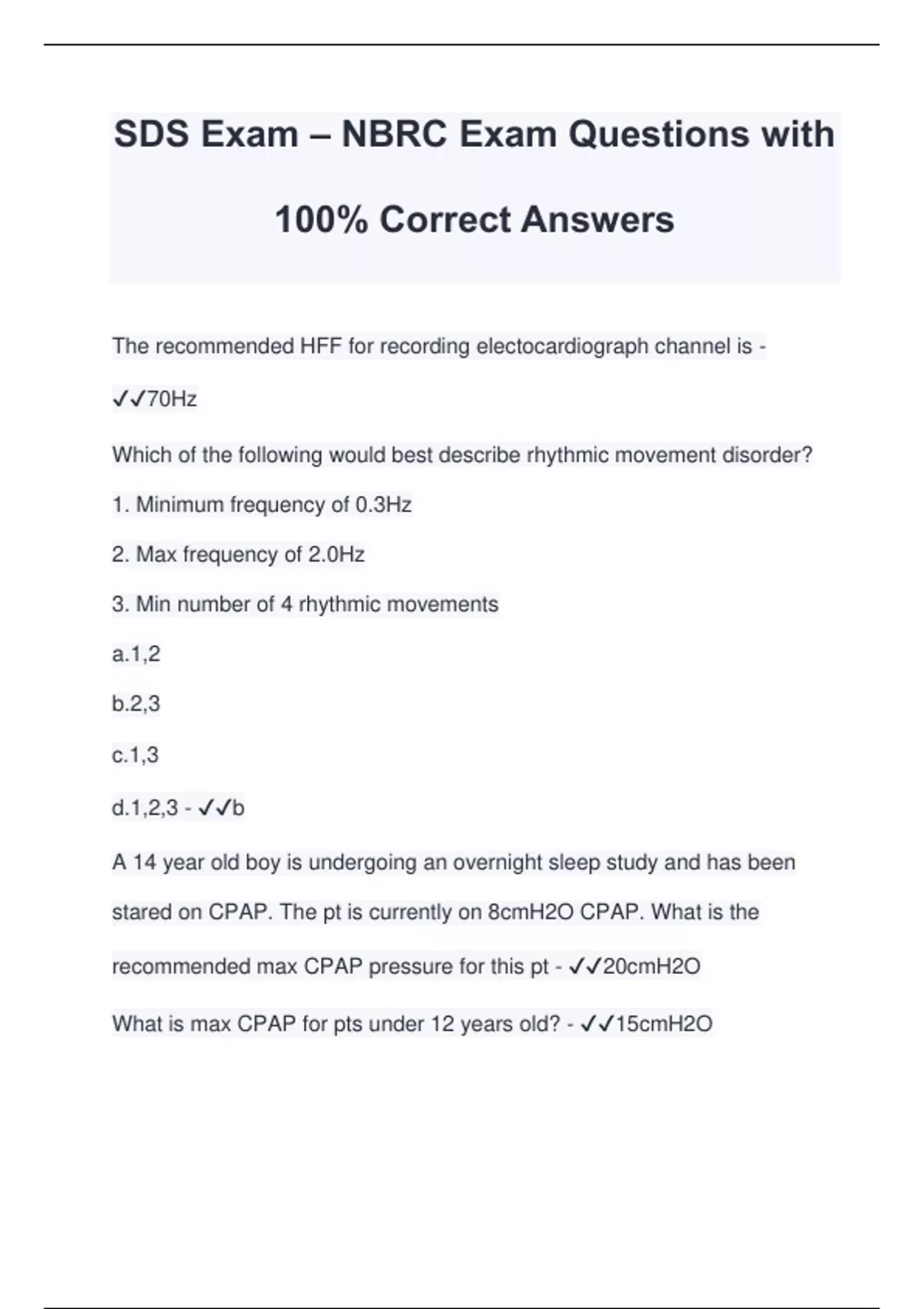 SDS Exam – NBRC Exam Questions with 100% Correct Answers The recommended HFF for recording electocardiograph channel is - 70Hz Which of the following would best describe rhythmic movement disorder? 1. Minimum frequency of 0.3Hz 2. Max frequency of 2.0Hz 3. Min number of 4 rhythmic movements a.1,2 b.2,3 c.1,3 d.1,2,3 - b A 14 year old boy is undergoing an overnight sleep study and has been stared on CPAP. The pt is currently on 8cmH2O CPAP. What is the recommended max CPAP pressure for this pt - 20cmH2O What is max CPAP for pts under 12 years old? - 15cmH2O
