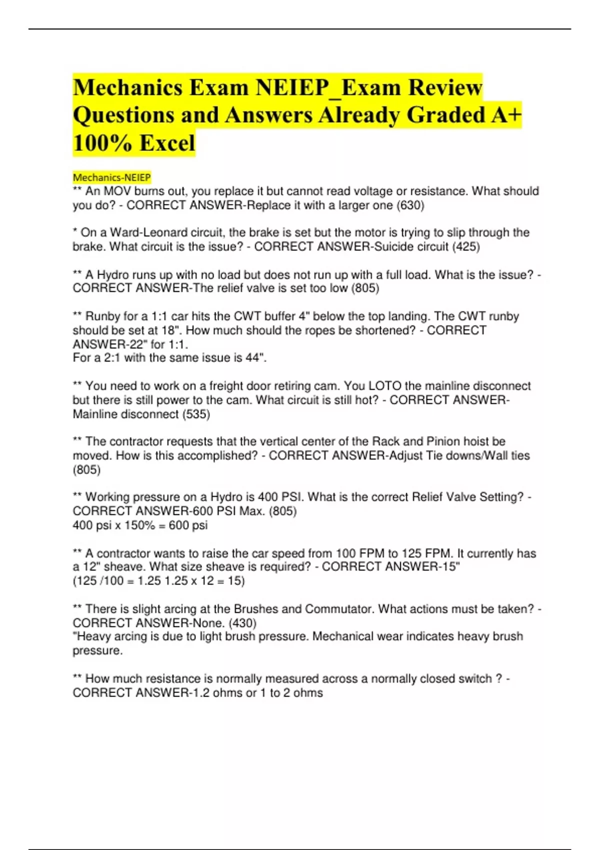 Mechanics Exam NEIEP_Exam Review Questions and Answers Already Graded A+ 100% Excel