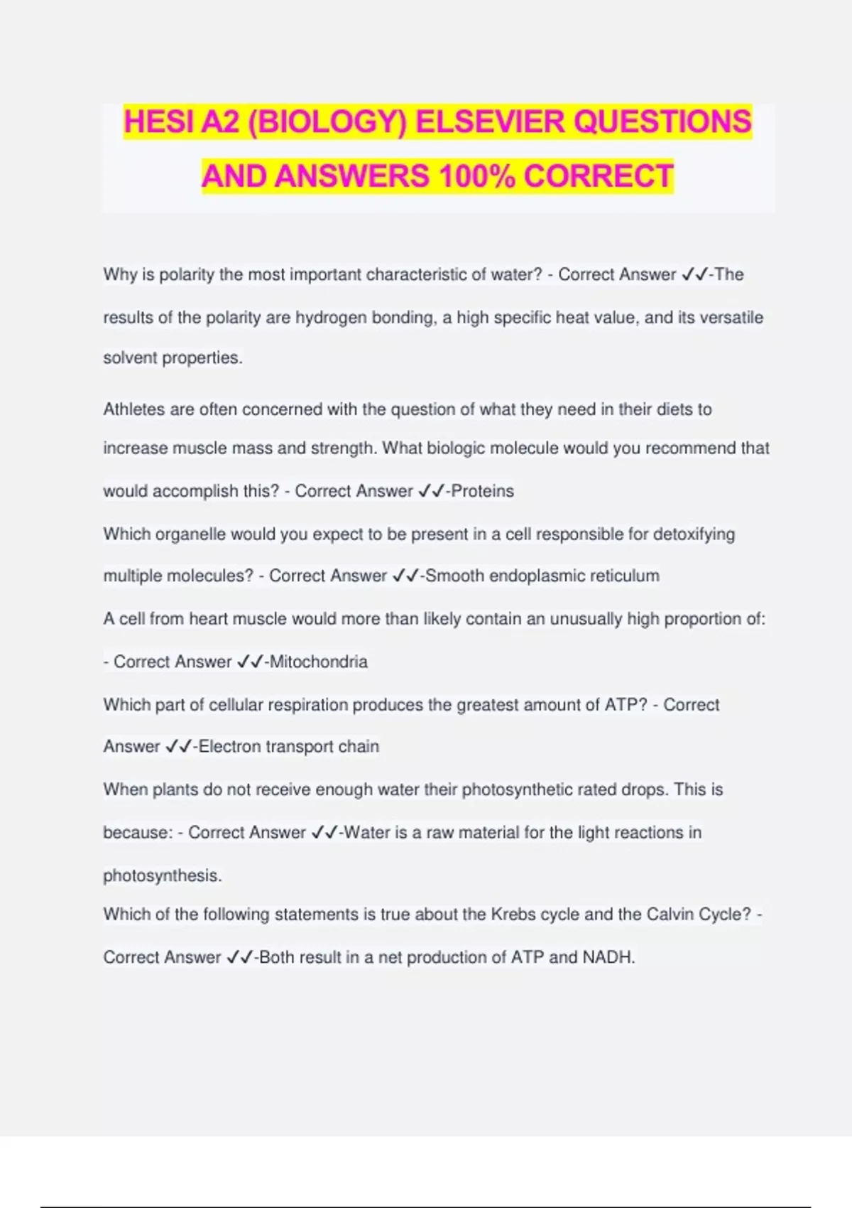 HESI A2 (BIOLOGY) ELSEVIER QUESTIONS AND ANSWERS 100% CORRECT Why is polarity the most important characteristic of water? - Correct Answer ️️ -The results of the polarity are hydrogen bonding, a high specific heat value, and its versatile solvent properties. Athletes are often concerned with the question of what they need in their diets to increase muscle mass and strength. What biologic molecule would you recommend that would accomplish this? - Correct Answer ️️ -Proteins Which organelle would you expect to be present in a cell responsible for detoxifying multiple molecules? - Correct Answer ️️ -Smooth endoplasmic reticulum A cell from heart muscle would more than likely contain an unusually high proportion of: - Correct Answer ️️ -Mitochondria Which part of cellular respiration produces the greatest amount of ATP? - Correct Answer ️️ -Electron transport chain When plants do not receive enough water their photosynthetic rated drops. This is because: - Correct Answer ️️ -Water is a raw material for the light reactions in photosynthesis. Which of the following statements is true about the Krebs cycle and the Calvin Cycle? - Correct Answer ️️ -Both result in a net production of ATP and NADH. Why is it important for cells to undergo mitosis? - Correct Answer ️️ -Mitosis produces cells for growth and repair of body tissue. 72 Chromosomes undergo meiosis. How many chromosomes will be in each gamete? - Correct Answer ️️ -36 Which of the following shows how information is transformed to make a protein? - Correct Answer ️️ -DNA-RNA- protein In the hierarchic system of classification, which of the following is the least inclusive? - Correct Answer ️️ -Species After observing an event, you develop an explanation. This statement is referred to as which of the following? - Correct Answer ️️ -Hypothesis A molecule of water is bonded with another molecule of water by w