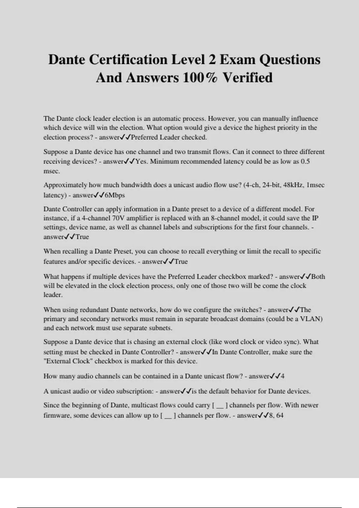 Dante Certification Level 2 Exam Questions And Answers 100% Verified The Dante clock leader election is an automatic process. However, you can manually influence which device will win the election. What option would give a device the highest priority in the election process? - answerPreferred Leader checked. Suppose a Dante device has one channel and two transmit flows. Can it connect to three different receiving devices? - answerYes. Minimum recommended latency could be as low as 0.5 msec. Approximately how much bandwidth does a unicast audio flow use? (4-ch, 24-bit, 48kHz, 1msec latency) - answer6Mbps Dante Controller can apply information in a Dante preset to a device of a different model. For instance, if a 4-channel 70V amplifier is replaced with an 8-channel model, it could save the IP settings, device name, as well as channel labels and subscriptions for the first four channels. - answerTrue When recalling a Dante Preset, you can choose to recall everything or limit the recall to specific features and/or specific devices. - answerTrue What happens if multiple devices have the Preferred Leader checkbox marked? - answerBoth will be elevated in the clock election process, only one of those two will be come the clock leader. When using redundant Dante networks, how do we configure the switches? - answerThe primary and secondary networks must remain in separate broadcast domains (could be a VLAN) and each network must use separate s