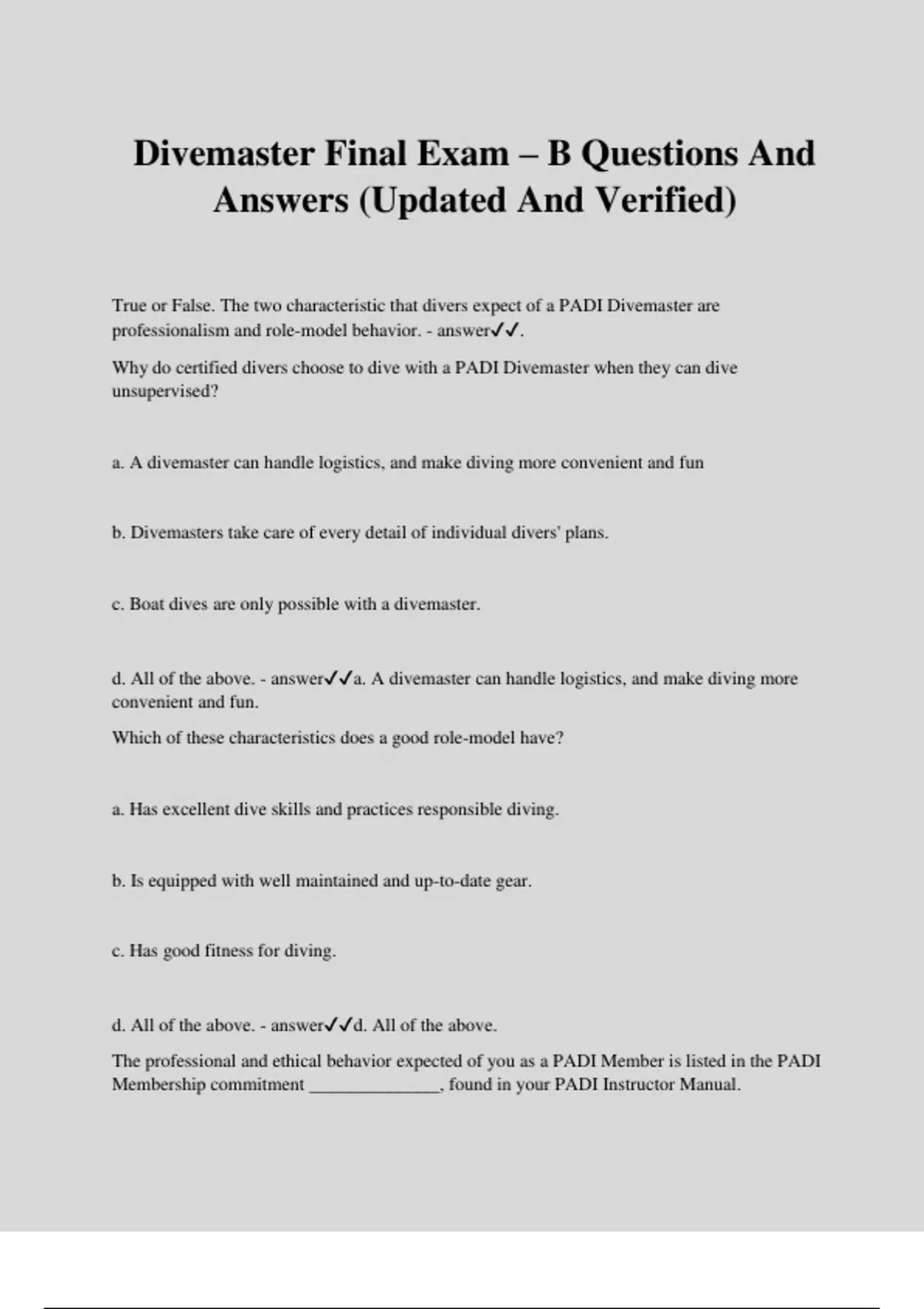 Divemaster Final Exam – B Questions And Answers (Updated And Verified) True or False. The two characteristic that divers expect of a PADI Divemaster are professionalism and role-model behavior. - answer. Why do certified divers choose to dive with a PADI Divemaster when they can dive unsupervised? a. A divemaster can handle logistics, and make diving more convenient and fun b. Divemasters take care of every detail of individual divers' plans. c. Boat dives are only possible with a divemaster. d. All of the above. - answera. A divemaster can handle logistics, and make diving more convenient and fun. Which of these characteristics does a good role-model have? a. Has excellent dive skills and practices responsible diving. b. Is equipped with well maintained and up-to-date gear. c. Has good fitness for diving. d. All of the above. - answerd. All of the above. The professional and ethical behavior expected of you as a PADI Member is listed in the PADI Membership commitment ______________, found in your PADI Instructor Manual.